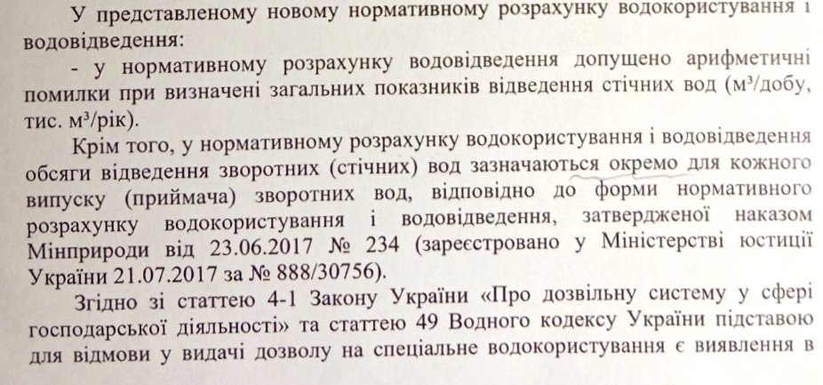 У відповіді за підписом заступника голови агентства Ігоря Гопчака йшлося, зокрема, про таке: «Нормативний розрахунок водокористування та водовідведення дозволяє ухвалювати управлінські рішення щодо забезпечення водокористувачів водними ресурсами в необхідній кількості з урахуванням водогосподарських балансів і за басейновим принципом.