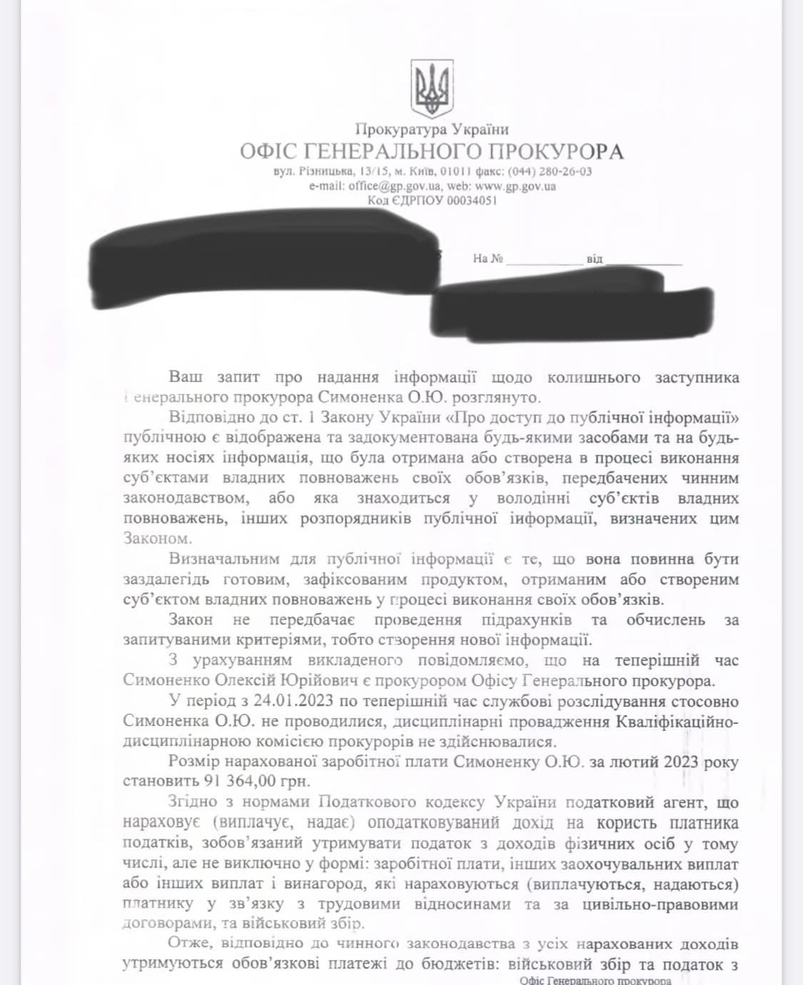 «На теперішній час Симоненко Олексій Юрійович є прокурором Офісу генерального прокурора», - йдеться у відповіді генпрокуратури.