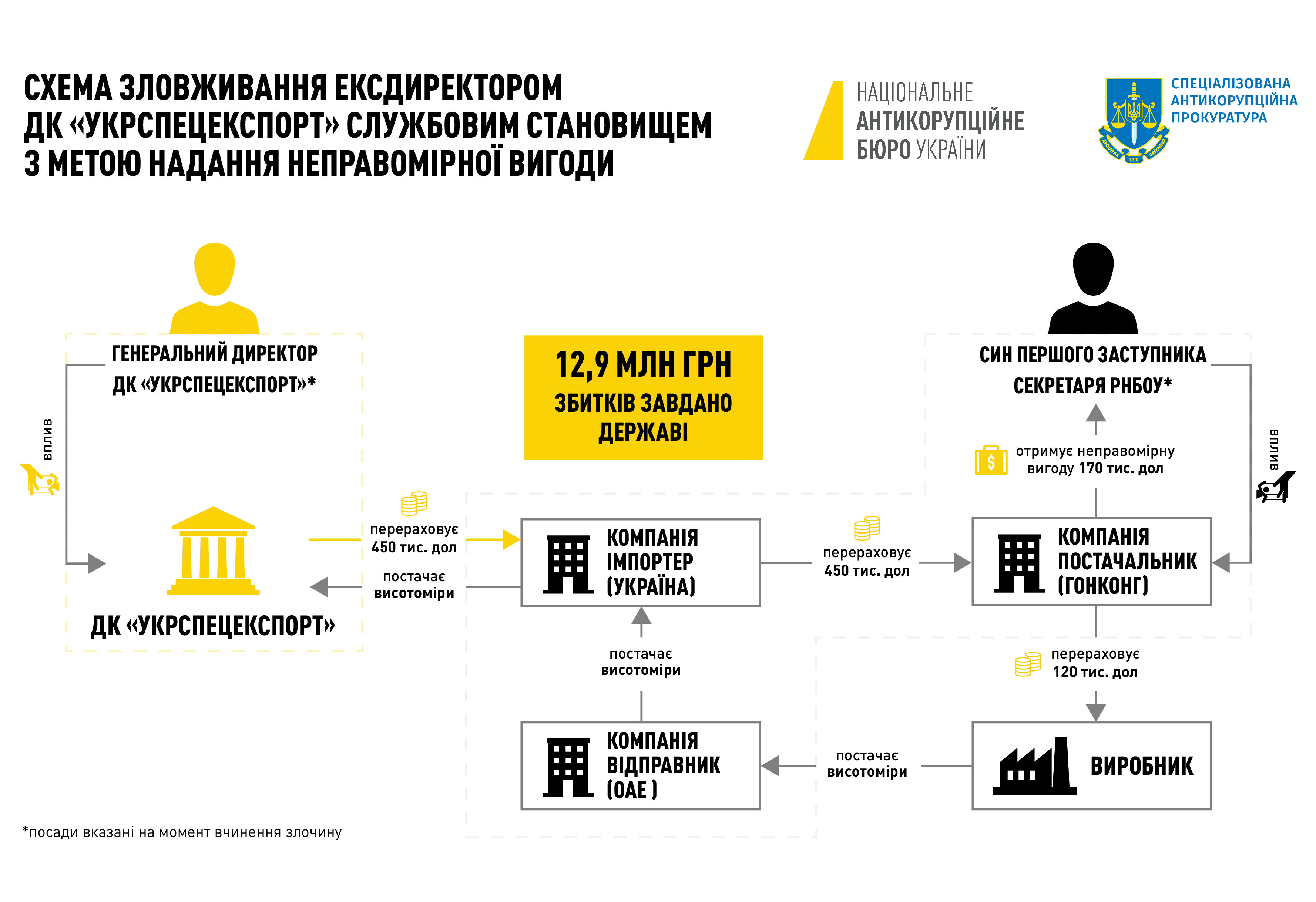 Національне антикорупційне бюро України та Спеціалізована антикорупційна прокуратура у п’ятницю, 6 жовтня, оголосили про підозри колишньому генеральному директору державної компанії «Укрспецекспорт» і сину експершого заступника секретаря Ради національної безпеки і оборони України у справі про зловживання службовим становищем зі збитками державі на майже 13 мільйонів гривень (за частиною 2 статті 364 Кримінального кодексу), повідомила пресслужба НАБУ.
