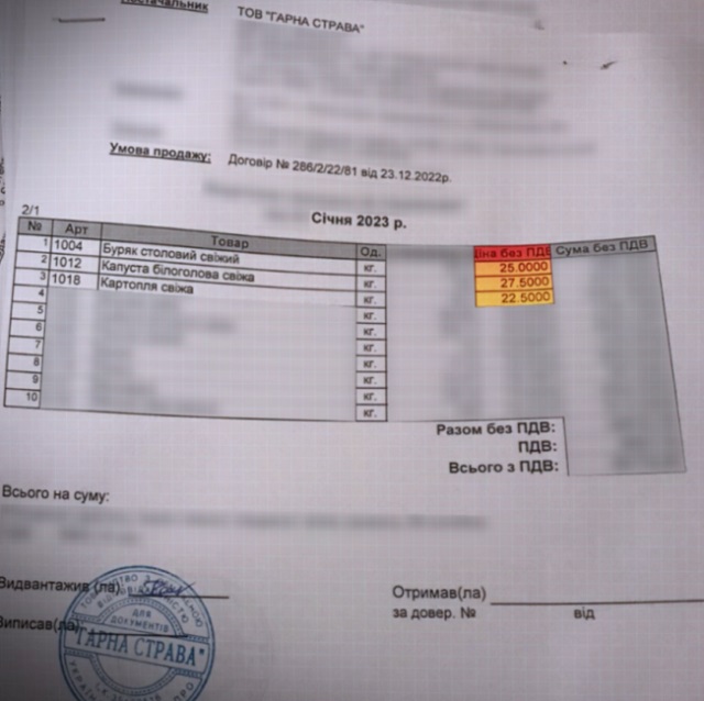 Картопля у першій версії договору з фірмою мала постачатись вже в січні по 27 грн/кг з ПДВ (у накладній ціна 22,5 грн без ПДВ), капуста – по 33 грн/кг, буряк – по 30 грн/кг. Але Bihus.Info дізнались, що «Гарна страва» в січні закуповувала картоплю по 7,2-10,5 грн (з ПДВ), капусту – за ціною до 12,5 грн/кг, буряк – до 11 грн/кг. Тобто ціни завищені приблизно утричі.