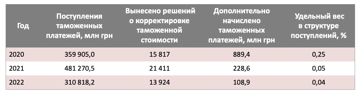 Із майже 311 млрд грн митних платежів, перерахованих платниками податків за 2022 рік, лише трохи більш як 108 млн грн, тобто 0,04%, забезпечено завдяки роботі з контролю над правильністю визначення митної вартості. У 99,96% випадків йдеться про добровільну сплату податків у повному обсязі.
