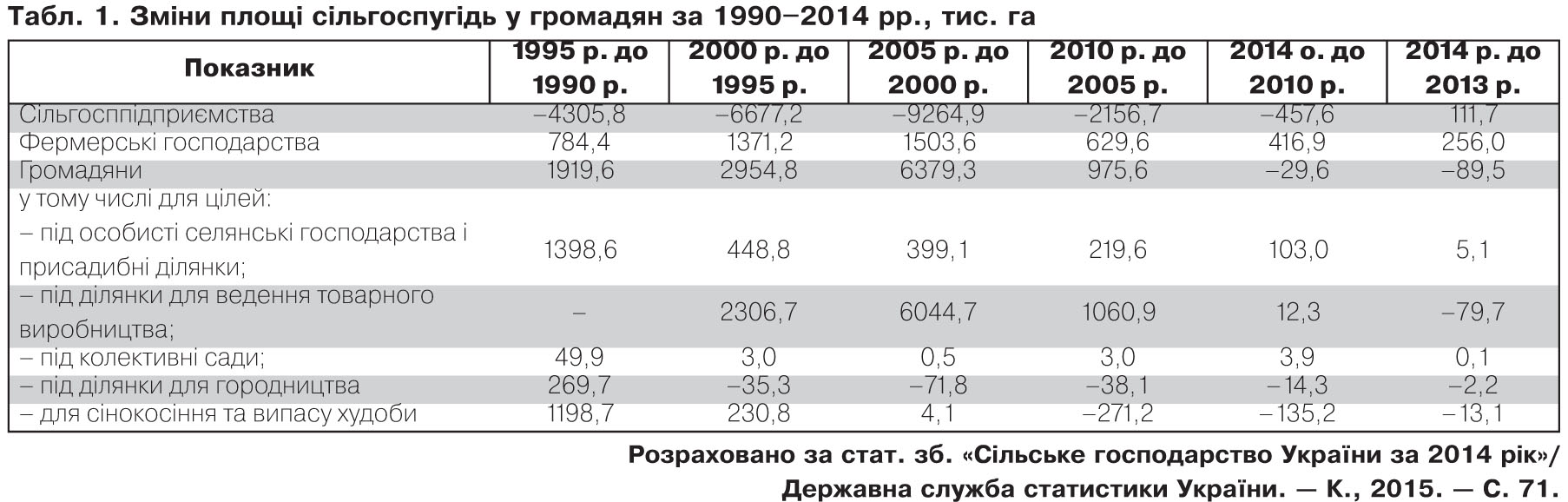 Початок і просування земельної реформи характеризувалися тим, що завдяки розпаюванню сільгоспугіддя активно переходили у власність громадян. Також із початку 90-х років масово надавалися ділянки для особистого селянського господарства, для садівництва і городництва, сінокосіння і випасання худоби, а також присадибні ділянки. Відтак, у 2014 р. у власності і користуванні громадян перебувало майже в шість разів більше сільгоспугідь, ніж було у 1990 р. (15,9 млн га проти 2,7 млн).