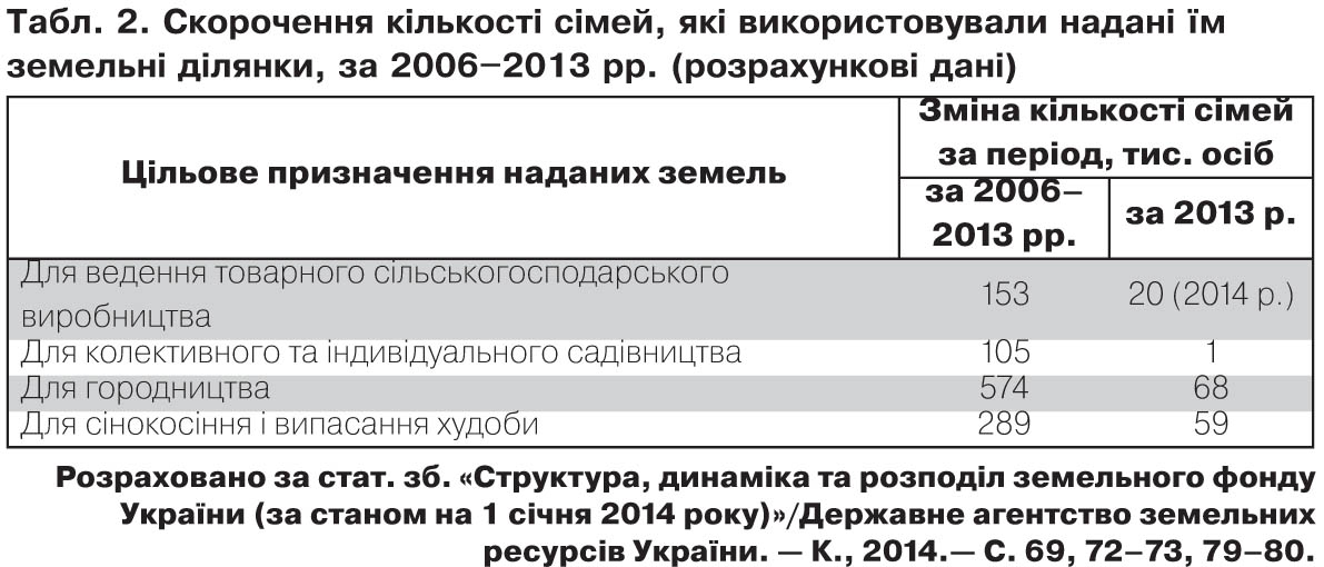 Вражає скорочення кількості сімей, що залишилися без тих чи інших земельних ділянок, на яких вони виробляли продовольство для самозабезпечення і реалізації надлишків на ринках (див. табл. 2).