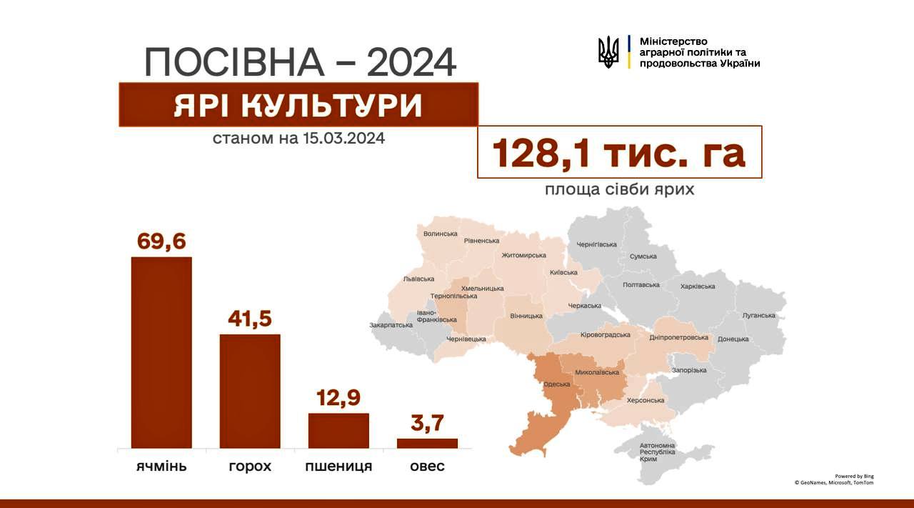 Найбільше висаджено ярих культур на Одещині де власне і почалась весняна кампанія 2024 року. За оперативними даними Міністерства аграрної політики в Одеській області засаджено 43000 га, що складає більше третини всіх висаджених ярих культур в Україні.