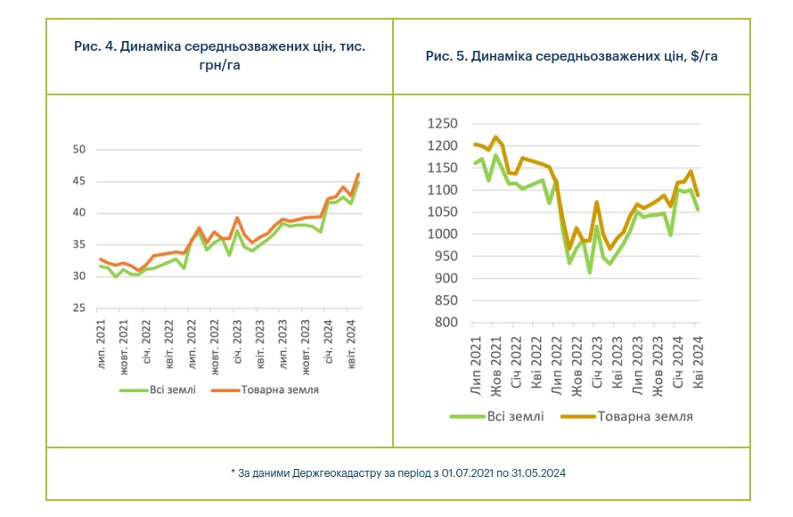 Ціни купівлі-продажу сільгоспземель в Україні зросли. Середньозважена ціна гектара землі в Україні склала 45 тисяч гривень за 1 га, що на 8,2% більше за квітневу вартість. “Причому ціна земель із цільовим призначенням “для ведення товарного сільськогосподарського виробництва” була ще вищою й сягнула 46,2 тис. грн”, – зазначають у дослідженні ринку землі України станом на травень експерти Київської школи економіки (KSE).