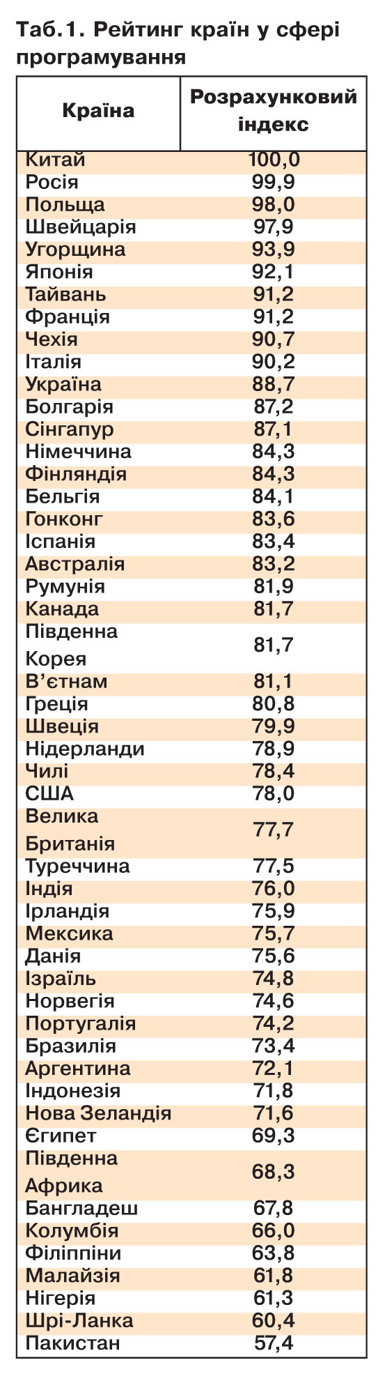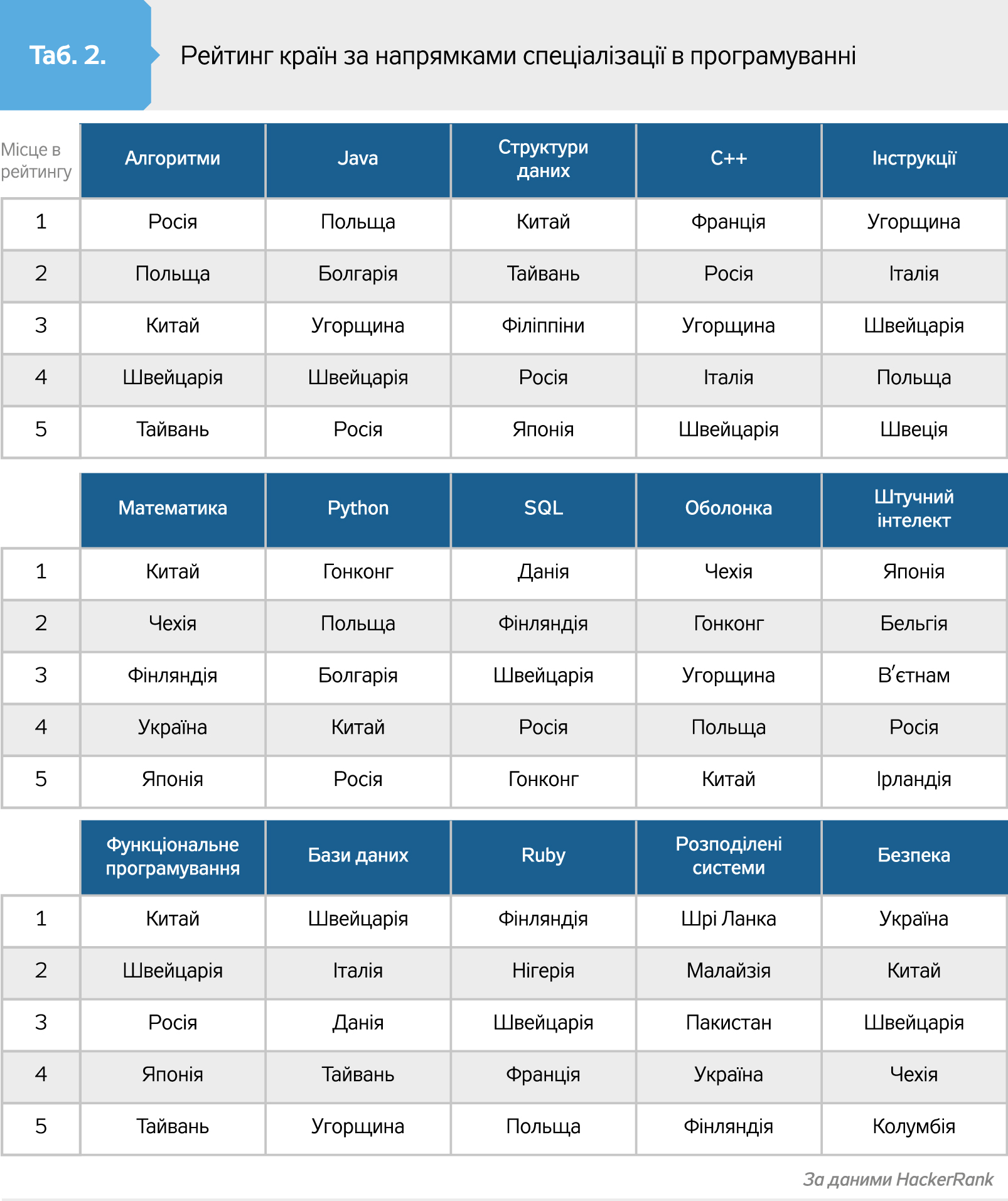 Ресурс із працевлаштування Hackerrank склав рейтинг найкращих програмістів у розрізі країн. За його даними, Україна посідає 11-те місце у світі за кваліфікацією програмістів. Якщо ж розглядати досягнення за напрямами спеціалізації, то вітчизняні програмісти лідирують у кібербезпеці (!), займають четверту позицію в математиці та розподілених системах.