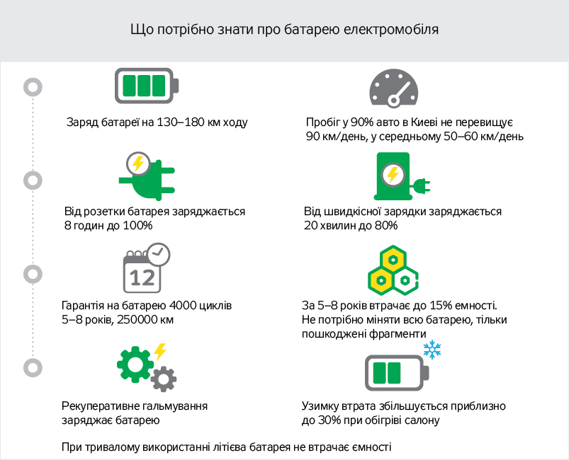 За даними Auto-consulting, середній добовий пробіг автомобіля в Києві не перевищує 60–80 км. Батарея електромобіля забезпечує 130–180 км пробігу, тому достатньо заряджати її щоночі, щоб потім весь день спокійно іздити містом.