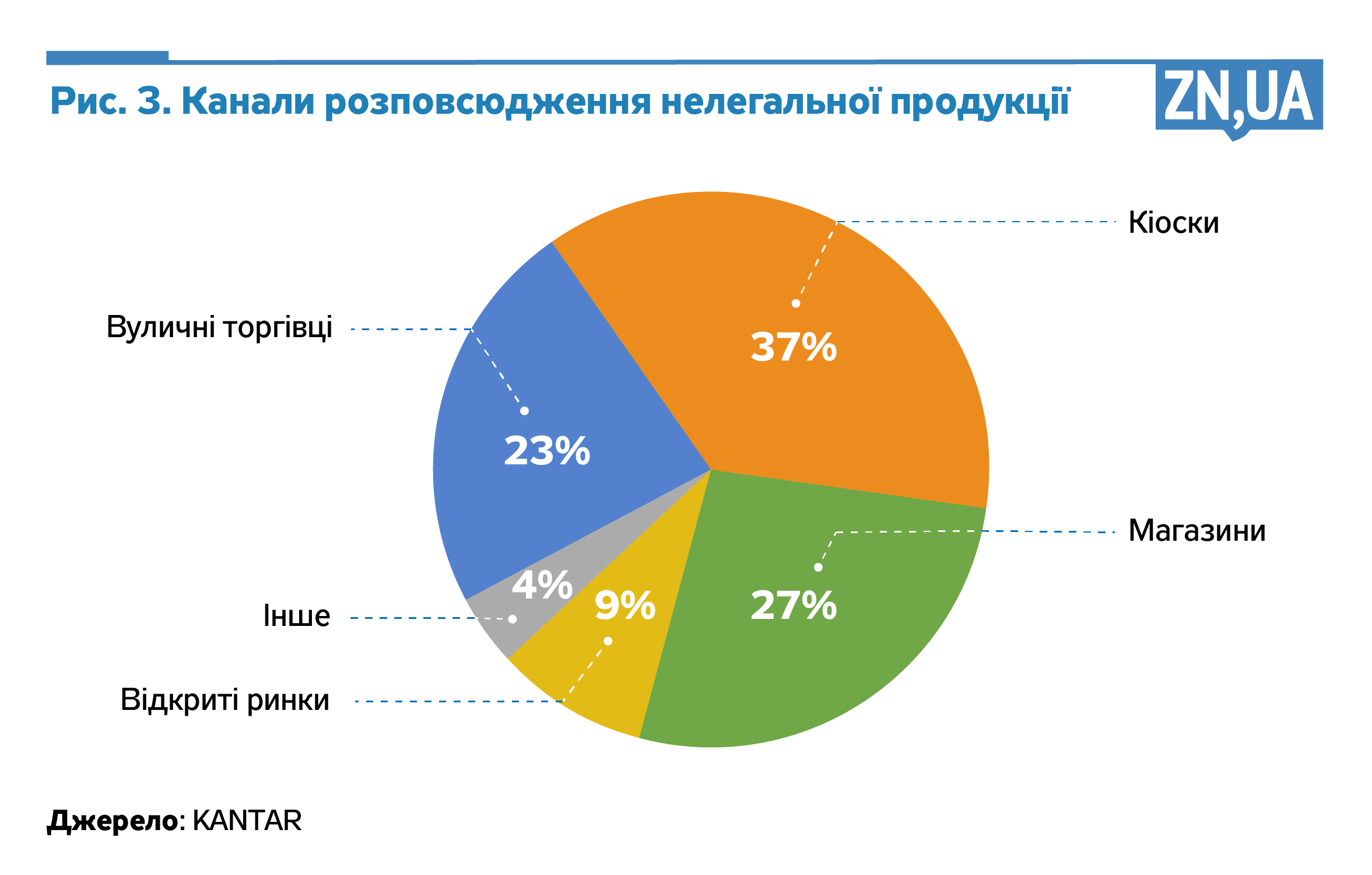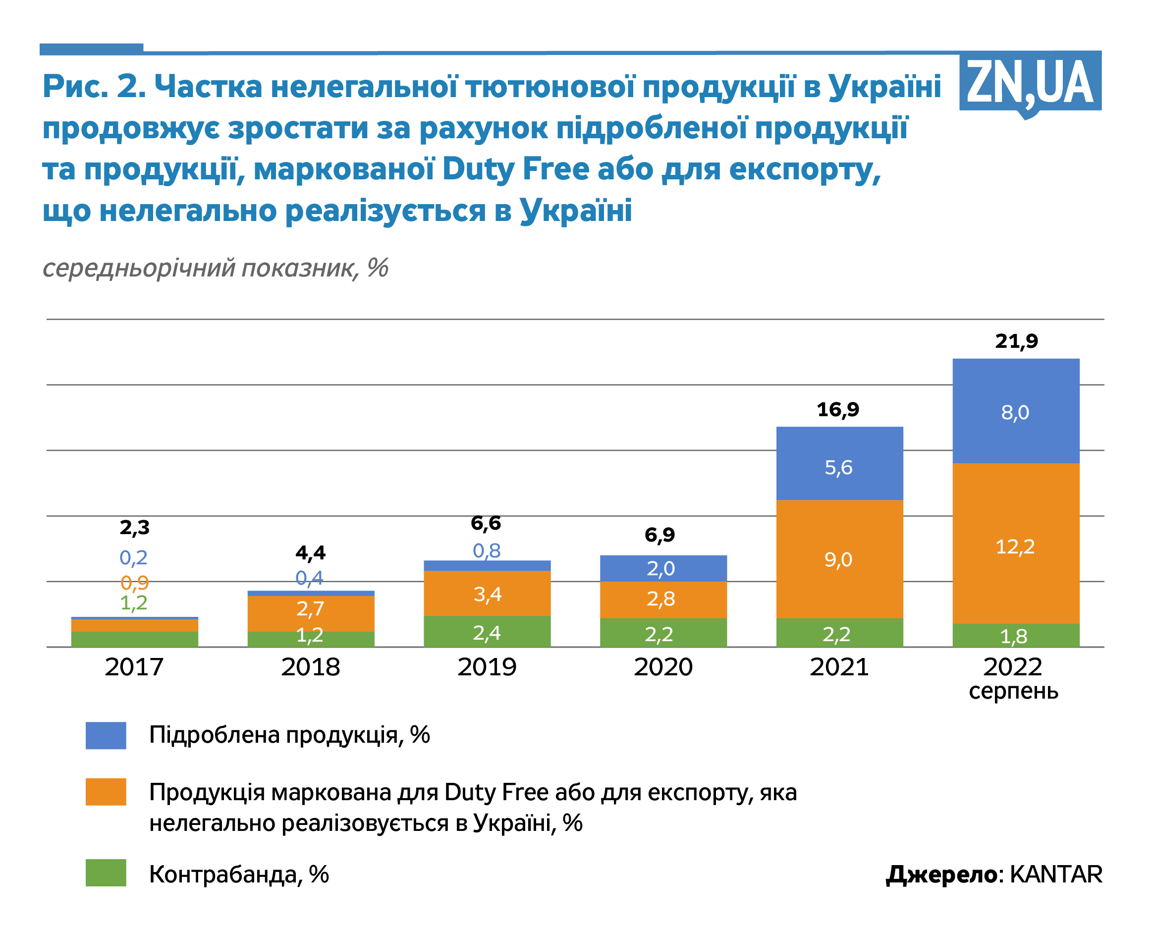За даними жовтневого звіту «Kantar Україна», частка нелегальної продукції на ринку тютюнових виробів України сягнула майже 22%. Також і війна значно збільшила можливості для махінацій фальсифікаторів. Результат їхньої економічної агресії більш ніж переконливий: за оцінкою «Kantar Україна» (Kantar — провідна світова компанія з обробки даних, аналітики та консалтингу), у 2022 році на тіньовому ринку України буде реалізовано 8,5 млрд нелегальних сигарет, держава недорахується в своєму бюджеті 20,7 млрд грн.