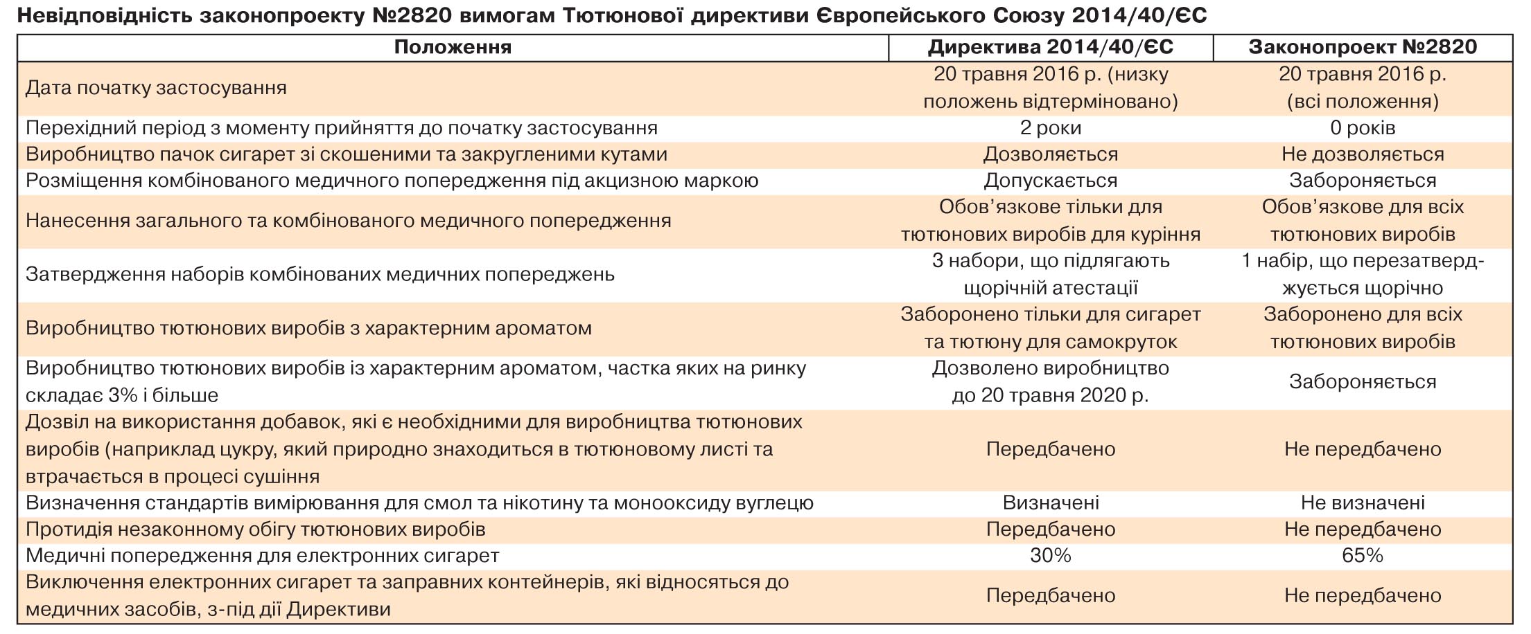 Крім того, розміщення на упаковці тютюнових виробів комбінованих медичних попереджень, які передбачені законопроектом, потребує перенесення акцизних марок на іншу частину упаковки (вони не повинні перекривати попередження і водночас мають розриватися при відкритті упаковки). Однак перехідного періоду для їх перенесення законопроект не передбачає (навіть попри те, що Директива надає додаткових три роки перехідного періоду для такого перенесення).