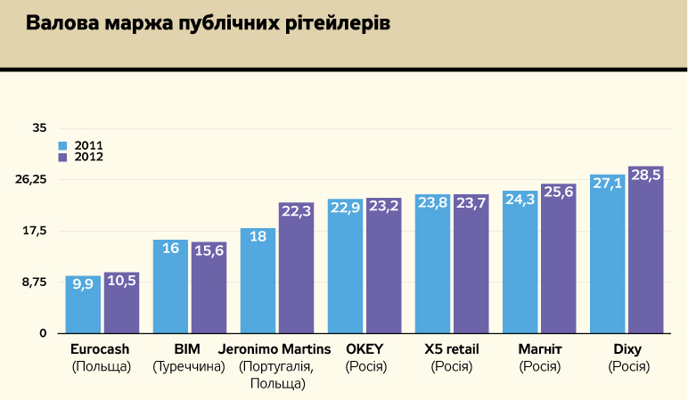 Отже, за рахунок усіх таких практик сукупна ефективна маржа - різниця між доходами і обґрунтованими витратами - українських ритейлерів із переважно продовольчим асортиментом у середньому становить 45%, тоді як польського Eurocash - 10,5, BIM (Туреччина) - 15,6, Jeronimo Martins (Португалія, Польща) - 22,3, російських X5 Retail, "Магнит", Dixy не дотягують і до 30%. (Див. рис.4 на сайті DT.UA).