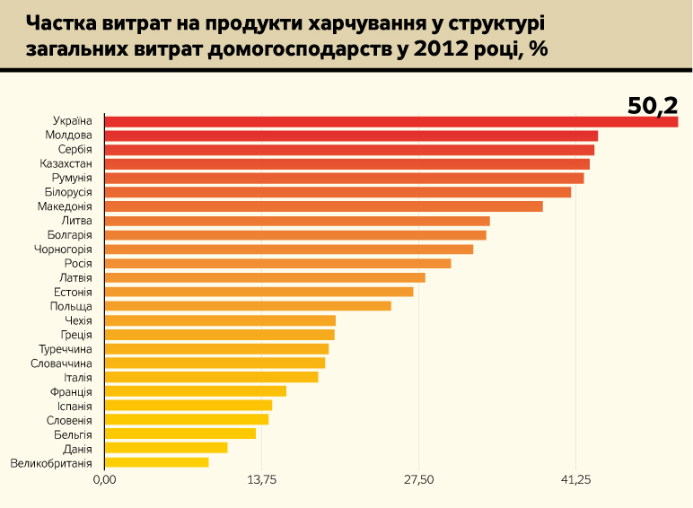 - У наведеній таблиці немає США. Американці витрачають на харчові продукти 10% сукупних доходів. При цьому майже 40% їжі викидають у помиї. Це десь