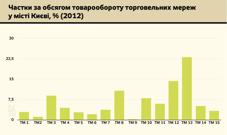 Якщо торговельна мережа (ТМ13) лідирує із найбільшою часткою 23%, то решта не дотягує і до 15%. А за нашим законодавством, базовий пороговий показник "монополізму" - 35%. (Див. рис.1 на сайті DT.UA).