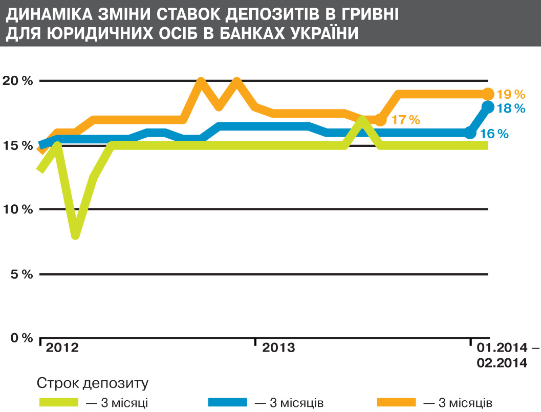 У зв'язку з останніми подіями в країні стурбованість своїх вкладників відчули практично всі банки. Однак цього разу більшість банківських клієнтів виявили розуміння й відмовилися від передчасного зняття депозитів. Відплив вкладів зупинити, звісно, не вдалося, але вдалося його стабілізувати, у тому числі за рахунок підвищення депозитних ставок. Тільки за лютий 2014 р. середні ставки за короткостроковими депозитами у гривні зросли відразу на 2,4 відсоткового пункту. Сьогодні середня дохідність таких вкладів для населення - 17,5-18,5% річних, максимальні ж ставки сягають 27,5% річних. Такими високими ставки за короткотерміновими вкладами були лише у 2009-