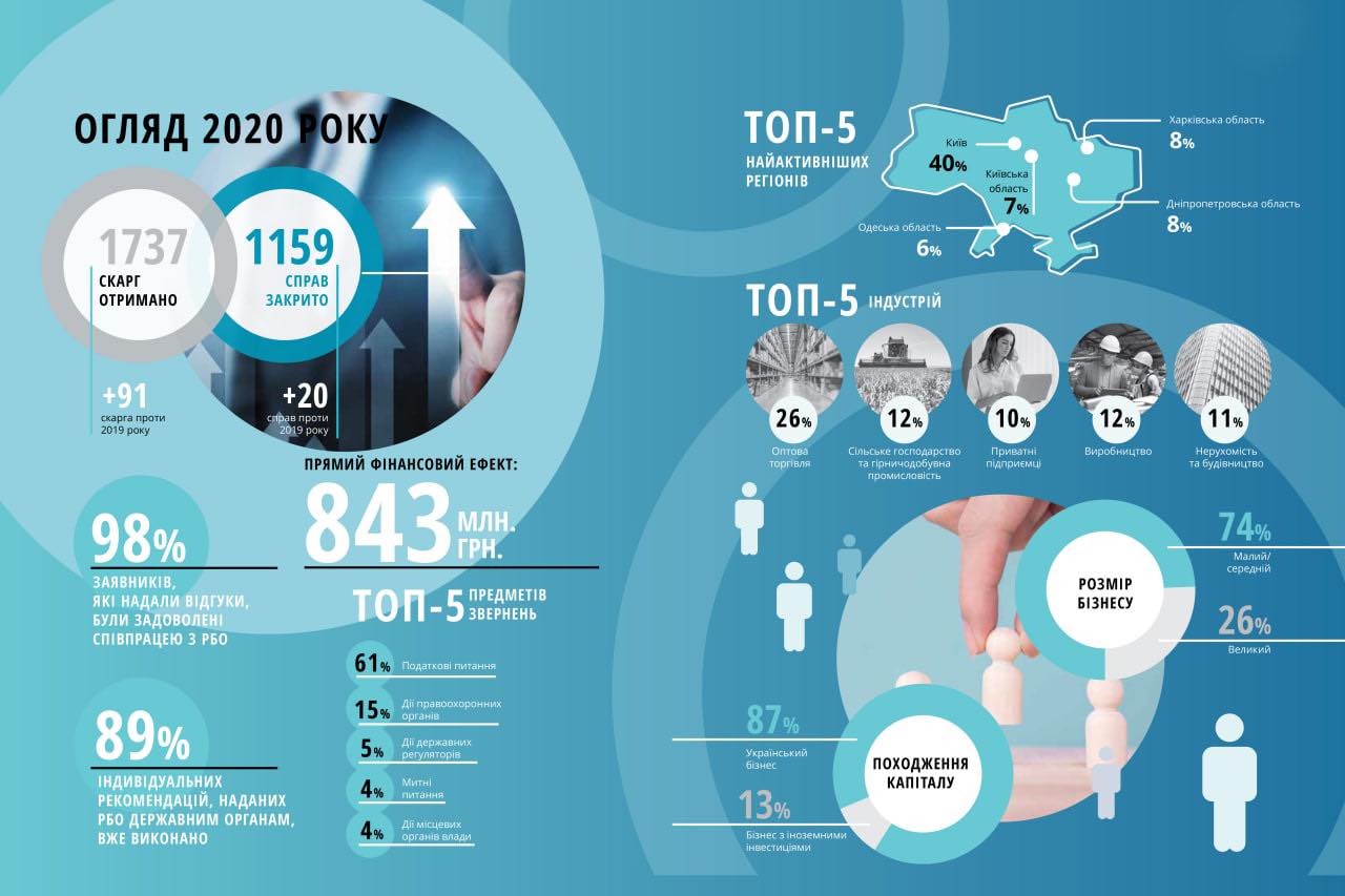 У четвертому кварталі 2020 року Рада бізнес-омбудсмена (РБО) отримала 451 скаргу бізнесу на дії та бездіяльність державних органів. Це на 9% більше, ніж за аналогічний період 2019-го, і на 3% більше порівняно з третім кварталом 2020-го. Установа також закрила більше справ — 293: плюс 18% проти четвертого кварталу 2019 року і плюс 7% проти третього кварталу 2020-го. Таким чином, РБО вдалося допомогти підприємцям повернути та заощадити 267 млн грн. Переважна більшість скаржників (98%), які заповнили форму зворотного зв’язку, залишилися задоволеними співпрацею з Радою бізнес-омбудсмена.