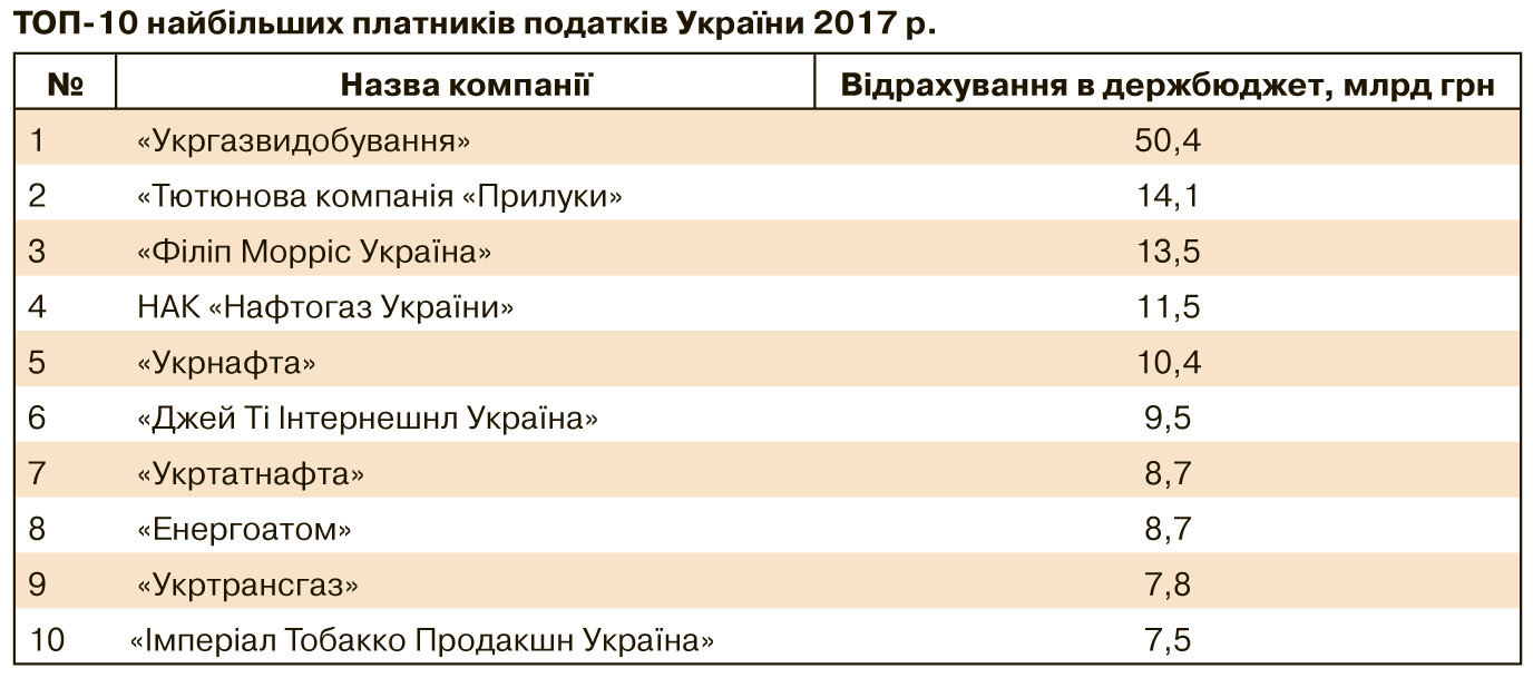 Якщо уважно подивитися на десятку найбільших платників податків 2017 р., опубліковану за підсумками року на сайті Державної фіскальної служби, то там, на жаль, ви не побачите ні найбільшого металургійного гіганта ПАТ "АрселорМіттал Кривій Ріг", ні будь-якої іншої металургійної компанії. Немає у ТОП-10 і жодної великої видобувної компанії або агрохолдингу, як немає й машинобудівних підприємств, будівельних велетнів або небідних операторів мобільного зв'язку.