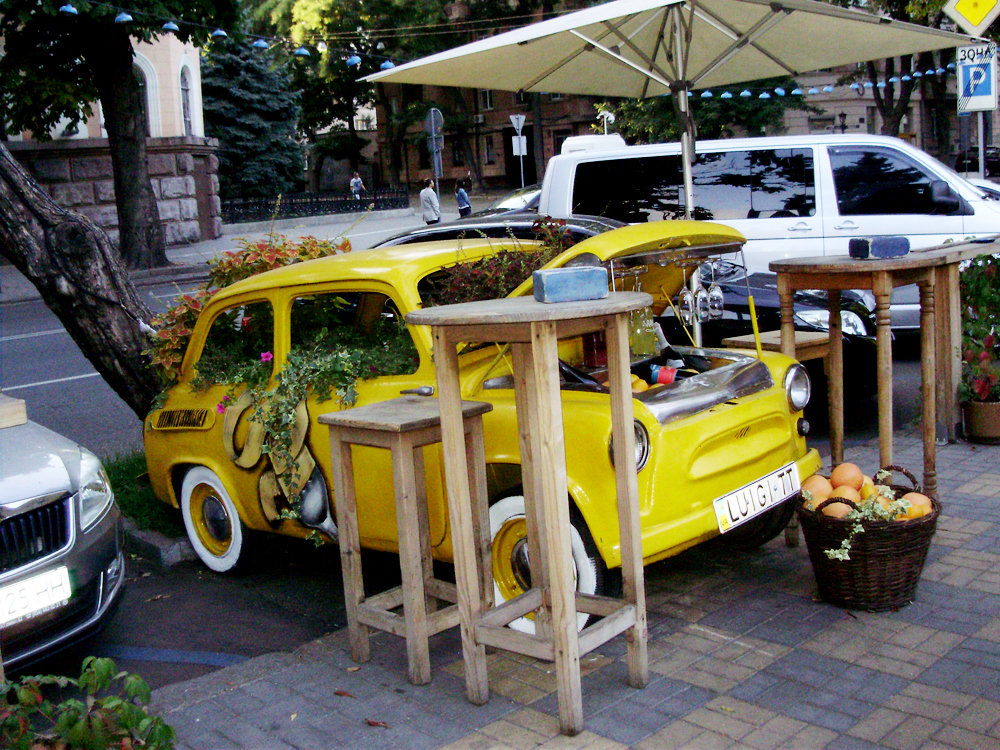 "Без "родзинки", оригінального дизайну, нових рішень сьогодні привабити клієнтів в Одесі нереально, - розповідає Андрій К., власник одного з кафе. - Підприємці намагаються знайти щось своє, ексклюзивне. Я бачив біля входу одного з кафе яскраво-жовтий справжній автомобіль, увесь салон якого заповнений живими квітами, а у відкритому капоті - колекція вин і висячі фужери".