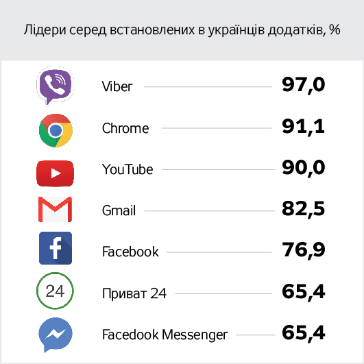Найцікавіше, що лідером серед установлених в українців додатків є зовсім не продукти американського гіганта, який поставляє операційну систему й інші сервіси на більшість смартфонів. Лідерство в Україні захопив Viber, встановлений у 97% користувачів! Цей месенджер набув особливої популярності й використовується як для спілкування в групах (з робочих питань, у школах і дитсадках), так і для дзвінків на інші мережі, щоб не витрачалися хвилини.