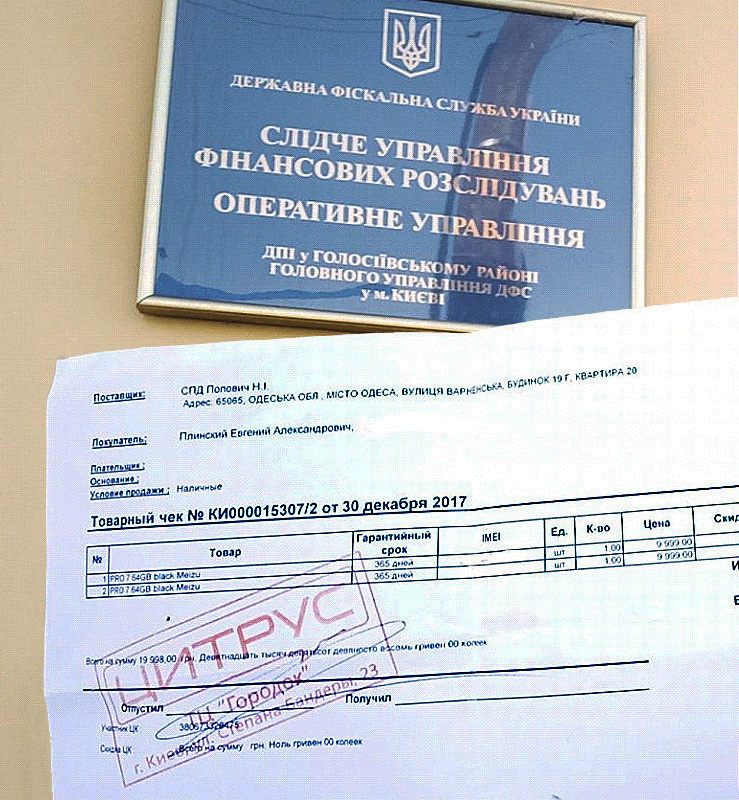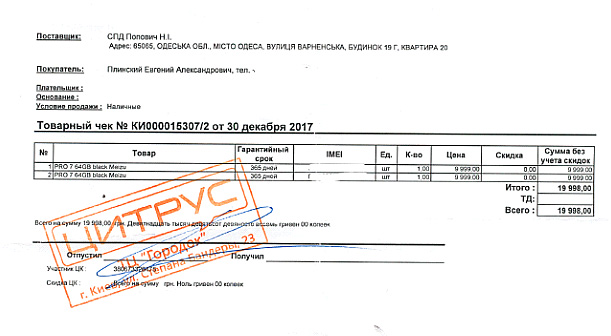 "30 грудня 2017 р., у торговельній мережі "Цитрус" я замовив два смартфони MEIZU. Приїхавши забирати товар у магазин за адресою Степана Бандери, 23, що в ТЦ "Городок" я, вистоявши передноворічну чергу, благополучно оплатив товар, після чого отримав два новенькі телефони і ось такий документ, що підтверджує мою покупку: без реквізитів продавця, без печатки, лише гарний жовтогарячий штамп "ЦИТРУС" і прізвище якогось ФОП.