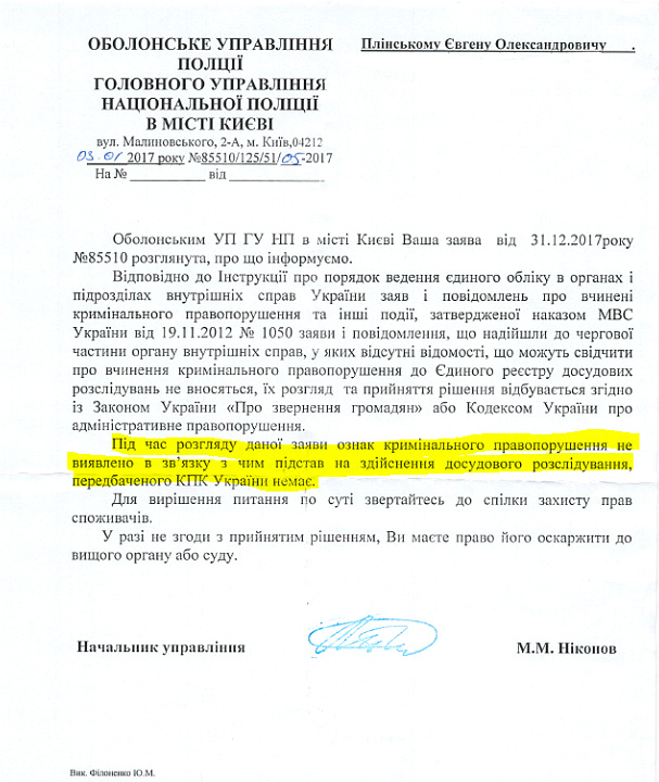 Та на моє здивування, 3.01.2018 р. Національна поліція надіслала мені відповідь, що у викладених мною фактах немає складу злочину, у зв'язку із чим підстав для початку досудового провадження немає.