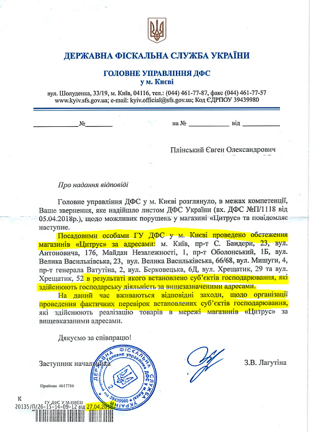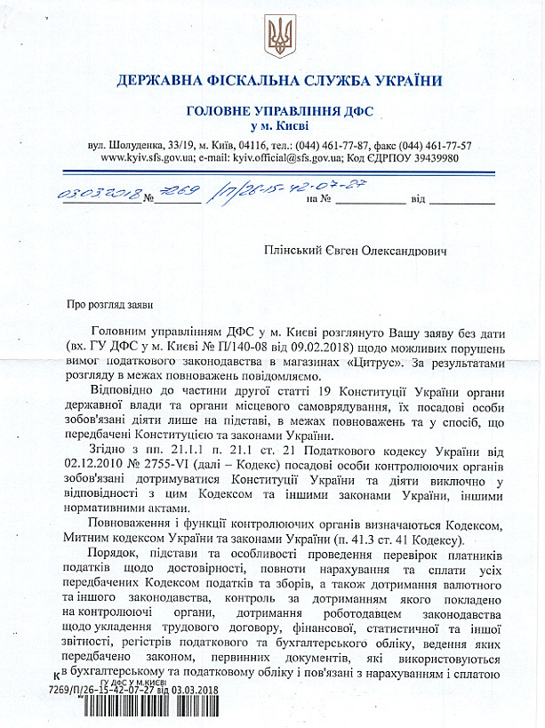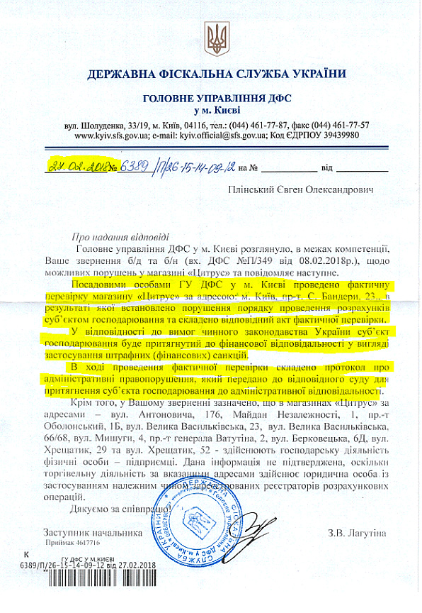 27.02.2018 р. надходить перша відповідь від заступниці начальника ДФС Києва Злати Лагутіної: у відповідь на мою заяву ДФС Києва проведено перевірку магазину "Цитрус" за адресою пр-т С.Бандери, 23. Посадові особи ДФС встановили порушення порядку розрахунків суб'єктом господарювання, про що було складено відповідний акт, і суб'єкта господарювання буде притягнуто до фінансової відповідальності у вигляді штрафних санкцій, і матеріали по цій справі вже передано до суду.