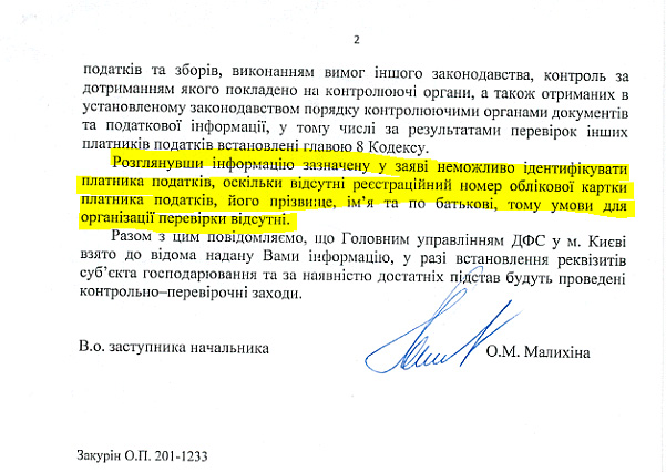 Вердикт пані Малихіної був менш радісний для мене. "Розглянувши надану вами інформацію, неможливо встановити особу платника податків, оскільки відсутній номер його картки платника податків, прізвище, ім'я, по батькові, тому умови для організації перевірки відсутні".