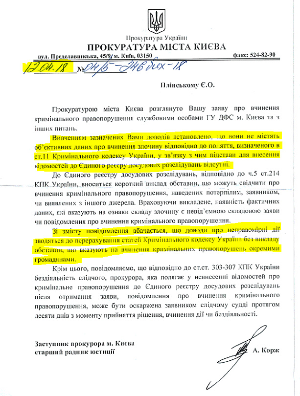 На моє розчарування, прокуратура Києва 12 квітня відповіла, що не знайшла в моїй інформації складу злочину співробітників ДФС Києва і відмовила в реєстрації ЄРДР.