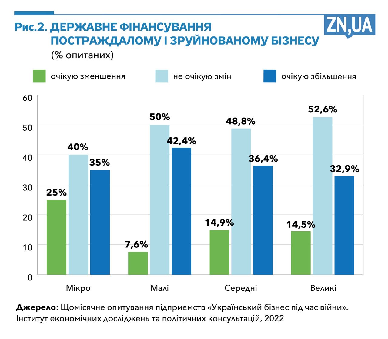 Традиційно потреби відрізняються для підприємств різного розміру. Мікробізнес приділяє більшу, ніж інші підприємства, увагу зменшенню корупції: цього очікують 33% мікропідприємств, тоді як серед решти груп бізнесу за розміром ця частка не перевищує 26%. Потреба у доступних кредитах також гостріше стоїть перед бізнесом менших розмірів: якщо серед великих підприємств таких кредитів чекають 16%, то з-поміж середніх — уже 20%, серед малих — 28%, а у мікробізнесі найбільше — 33% підприємств.