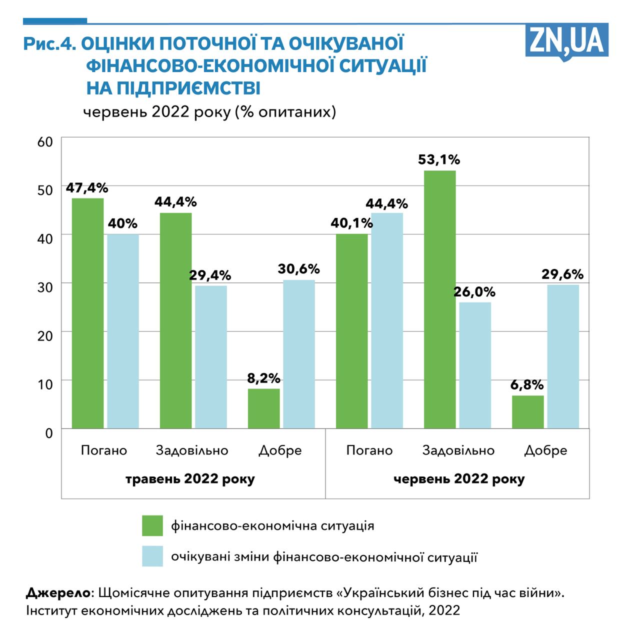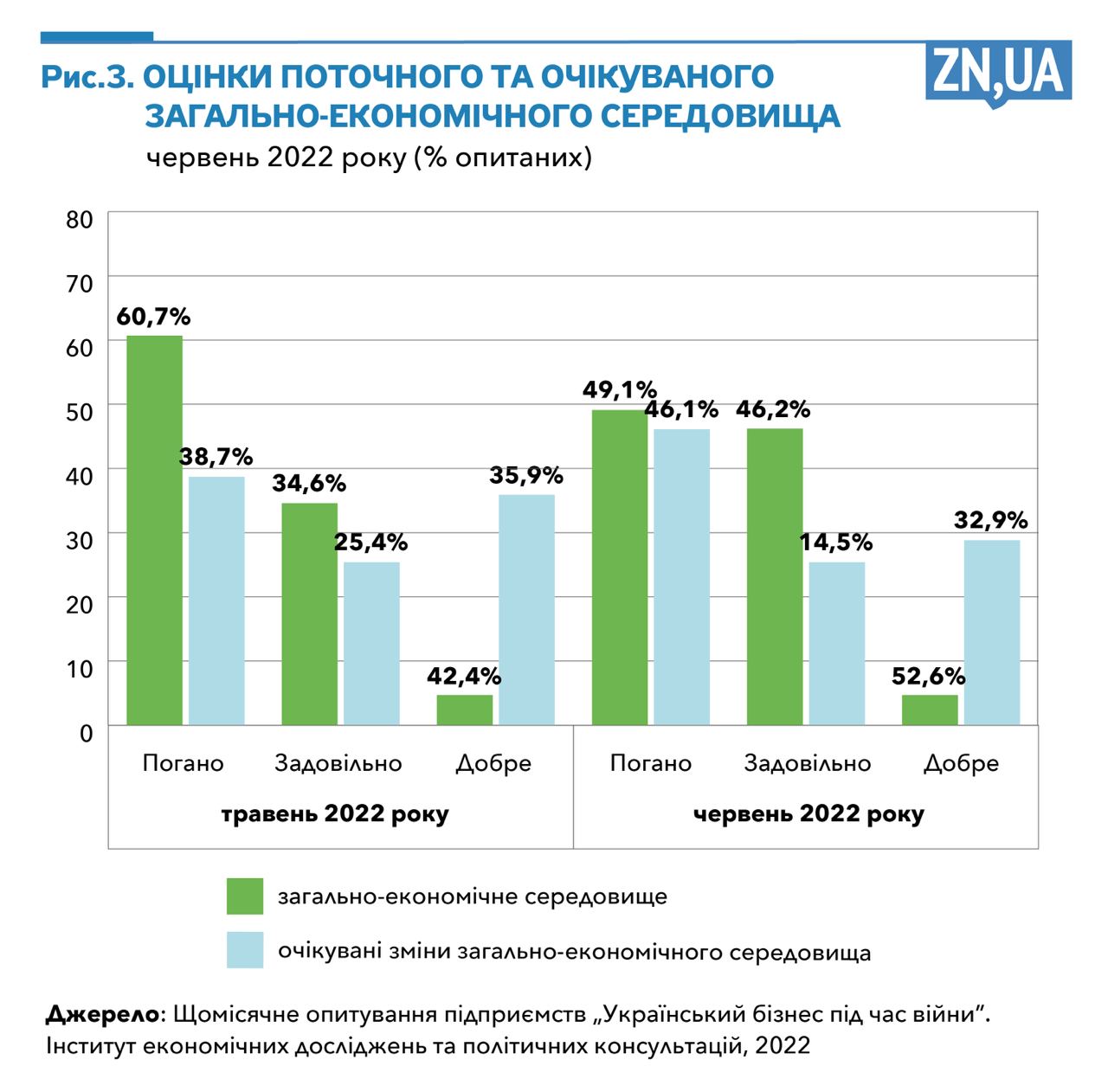 Оцінки бізнесом ділового середовища низькі, але вони покращуються (див. рис. 3). Якщо у травні загальне економічне становище оцінювали як погане 60,7% опитаних, то в червні — вже 49,1%. Також із 34,6 до 46,2% збільшилась частка тих, хто вважає, що загальноекономічне середовище задовільне. Однак частка позитивних оцінок не змінилась і становить 4,7%.