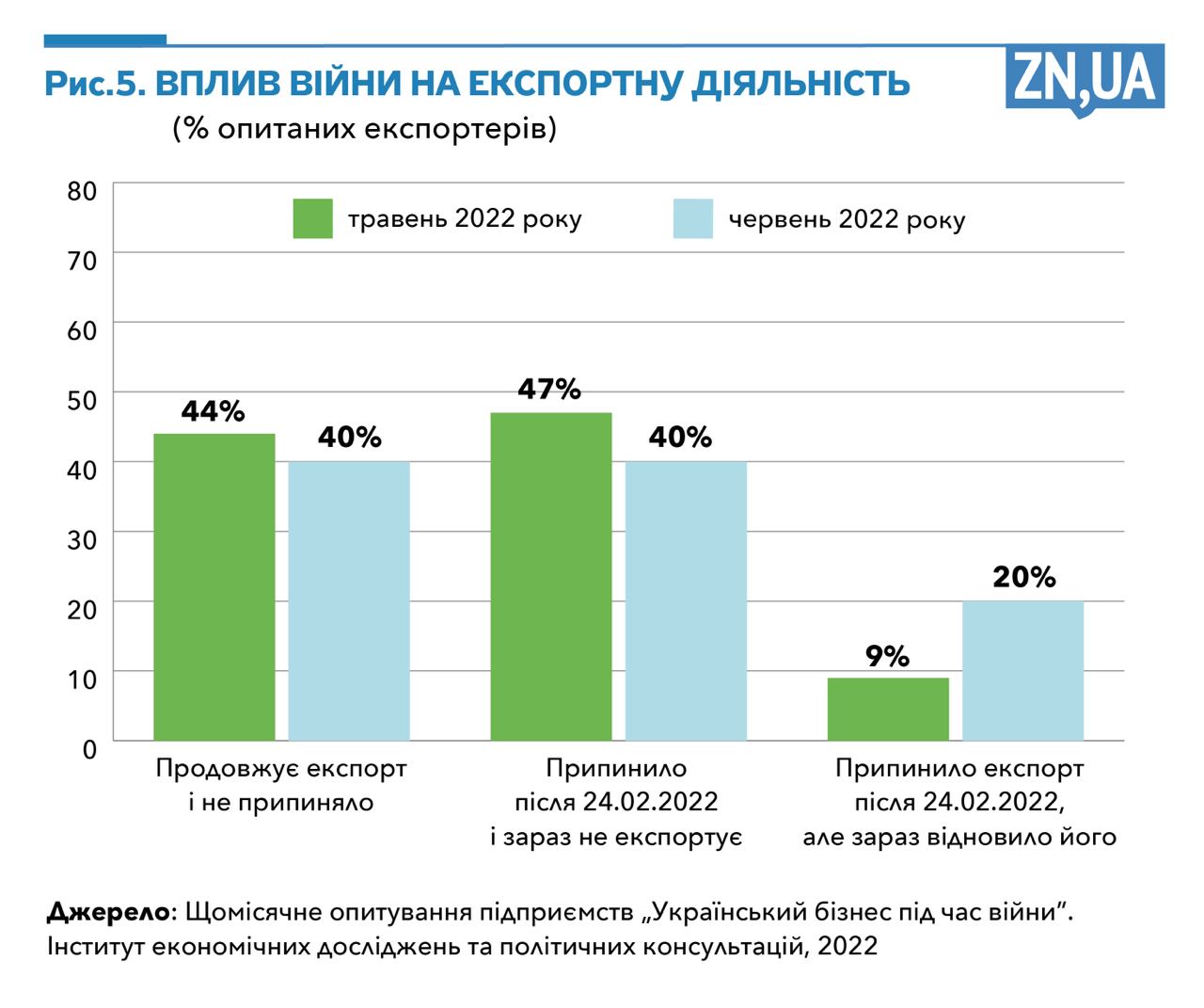 Війна стала вагомою перешкодою для зовнішньоекономічної діяльності. 40% опитаних експортерів припинили експорт після 24 лютого 2022 року і станом на червень не змогли його відновити (див. рис. 5). При цьому частка таких підприємств скоротилася: у попередньому місяці вона становила 47%. Однак підприємства працюють над відновленням експорту. Частка підприємств, які припиняли експорт, але відновили його, зросла з 9 до 20%.