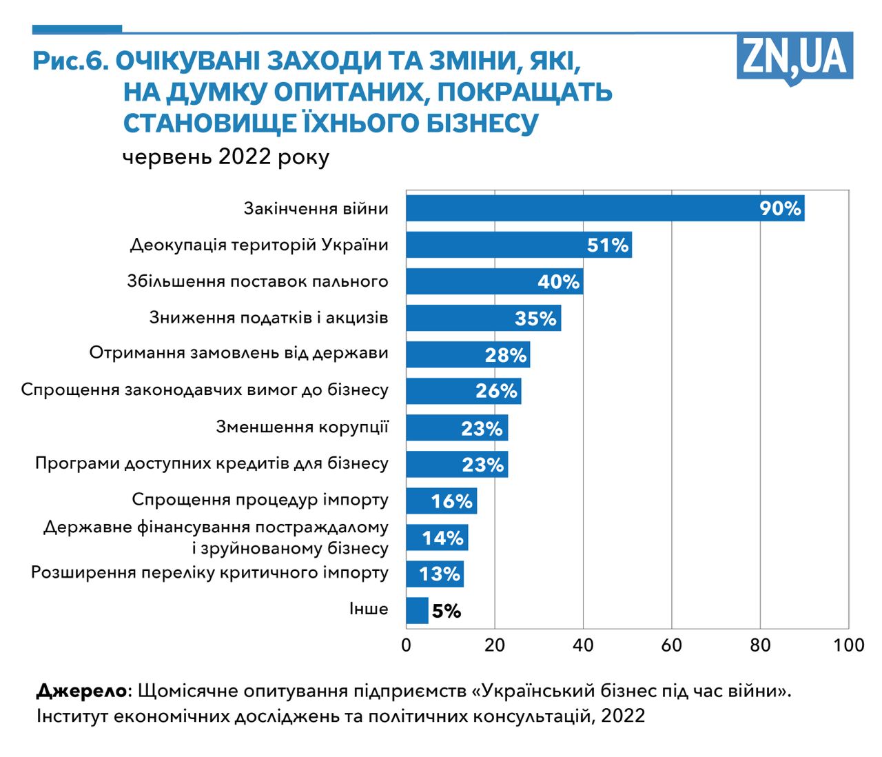 Український бізнес, як і вся країна, чекає перемоги та завершення війни, які дозволять повернутися до мирного ритму життя. 90% опитаних вважають, що найкраще на становище їхнього бізнесу може вплинути закінчення війни (див. рис. 6). Кожен другий представник бізнесу очікує деокупації територій України (51%). Закінчення війни є найголовнішим пріоритетом для бізнесу різних розмірів.