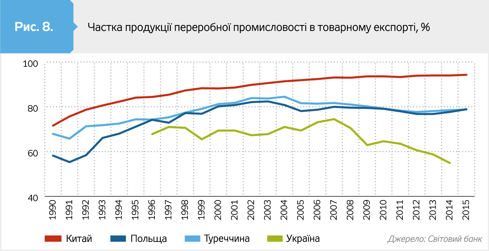 Тому Україна повинна зреалізувати низку політик, які забезпечать наздоганяюче економічне зростання. Наздоганяюче - це коли ВВП країни упродовж тривалого періоду часу, а це не менше ніж 20 років, збільшується в середньому, мінімум, на 5% щорічно. Ключовим тут є слово "тривалий". А його не може забезпечити економіка, що залежить від сировинних циклів, тобто така, як наша. Отже, потрібна інша, диверсифікована структура економіки, де ключову роль відіграють переробні виробництва, що створюють вищу додану вартість.