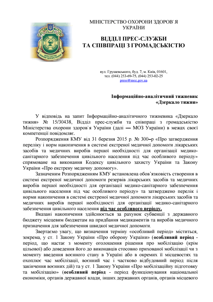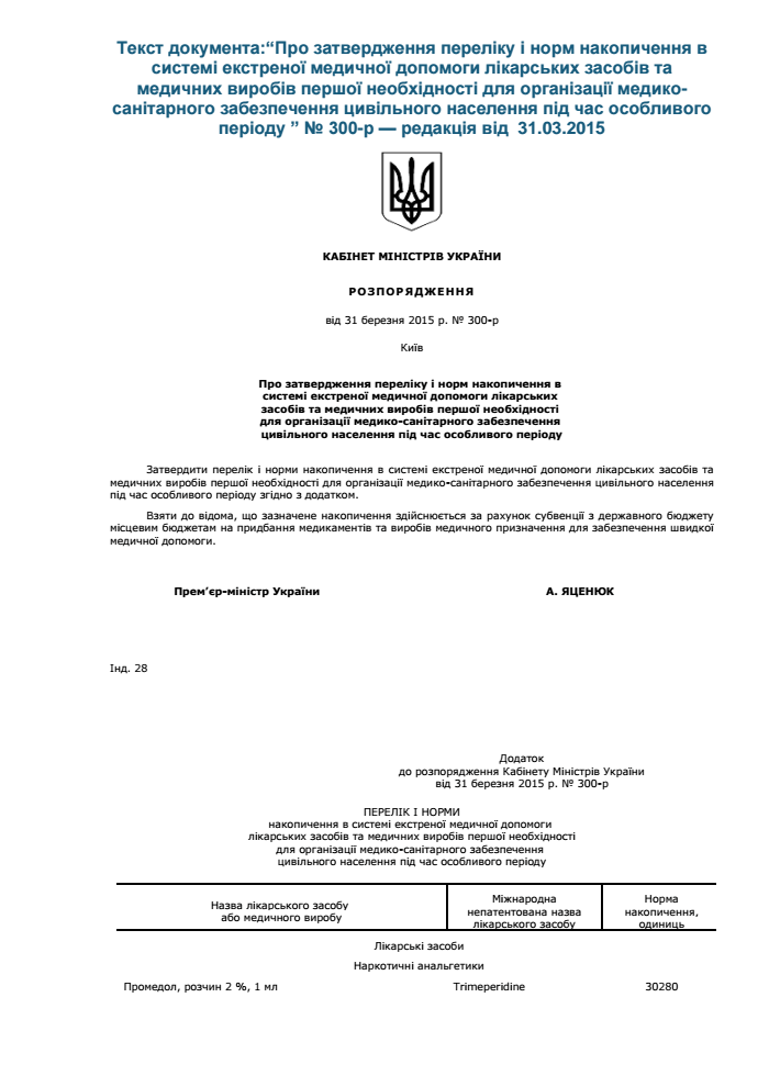 На этот раз речь идет о не справедливо затерявшемся в коридорах власти распоряжении Кабинета министров №300-р от 31.03.2015 г. с длинным и важным названием: "Об утверждении перечня и норм накопления в системе экстренной медицинской помощи лекарственных средств и медицинских изделий первой необходимости для организации медико-санитарного обеспечения гражданского населения во время особого периода".