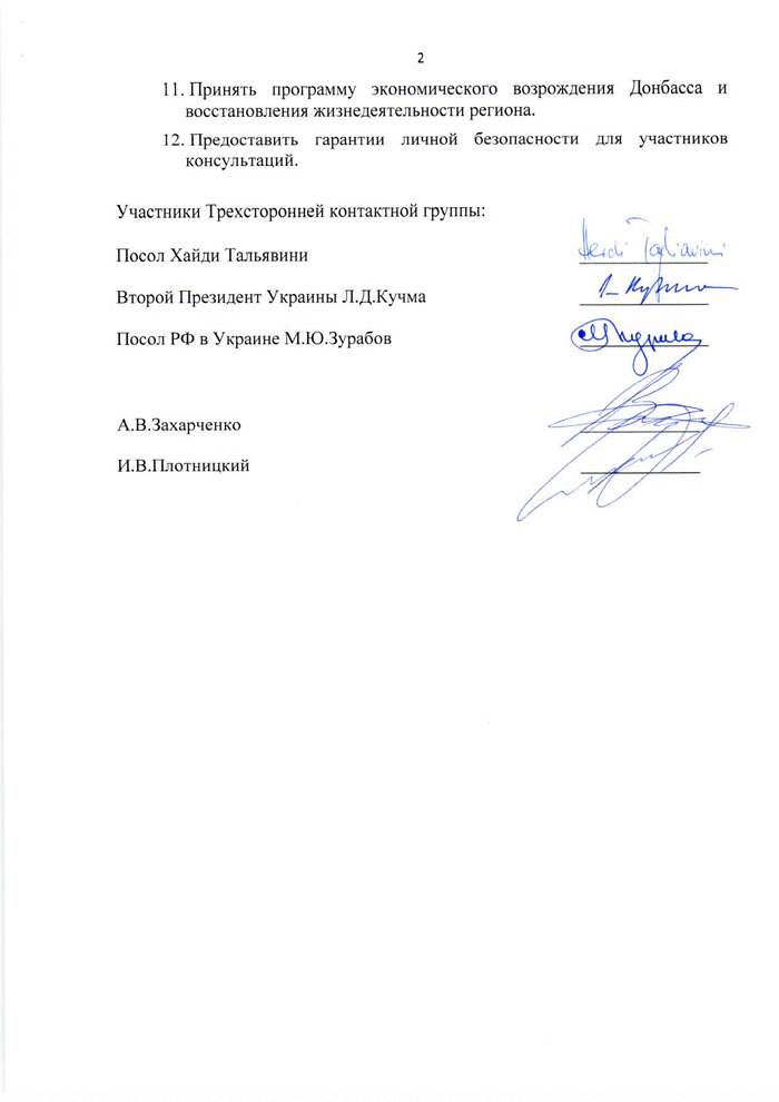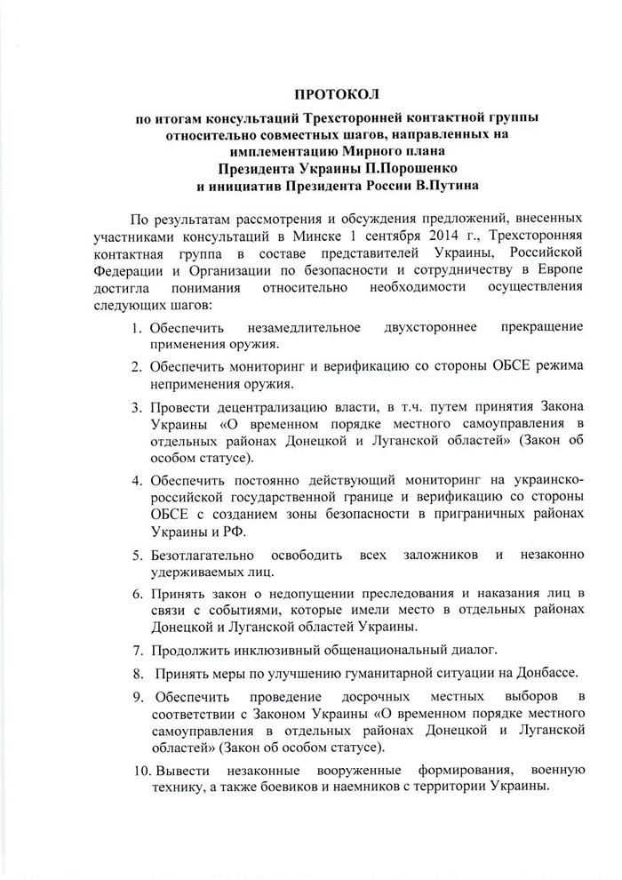 По результатам рассмотрения и обсуждения предложений, внесенных участниками консультаций в Минске 1 сентября 2014, Трехсторонняя контактная группа в составе представителей Украины, Российской Федерации и Организации по безопасности и сотрудничеству в Европе достигла согласия относительно необходимости осуществить следующие шаги: