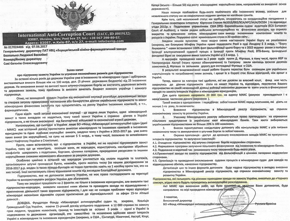 "У червні нинішнього року керівництво нашого заводу отримало листа від організації з дивною назвою - БО "Фонд "Міжнародні антикорупційні суди", - розповідає заступник генерального директора з інвестиційно-юридичних питань ПАТ НВЦ "Борщагівський хіміко-фармацевтичний завод" Олег Голобородько. - У цьому листі за підписом виконавчого директора МАКС Руслани Броніної зазначалося, що фонд давно і плідно бореться з корупцією не лише в Україні, а й за її межами. І далі все так хвацько розписано - і як багато виграно справ у судах, зокрема міжнародних, і на які величезні суми і з якими міжнародними організаціями (Інтерпол, Європейський суд аудиторів, Податкове управління США та ін.) координує свою діяльність вищеназваний фонд. Після вражаючого переліку здобутків