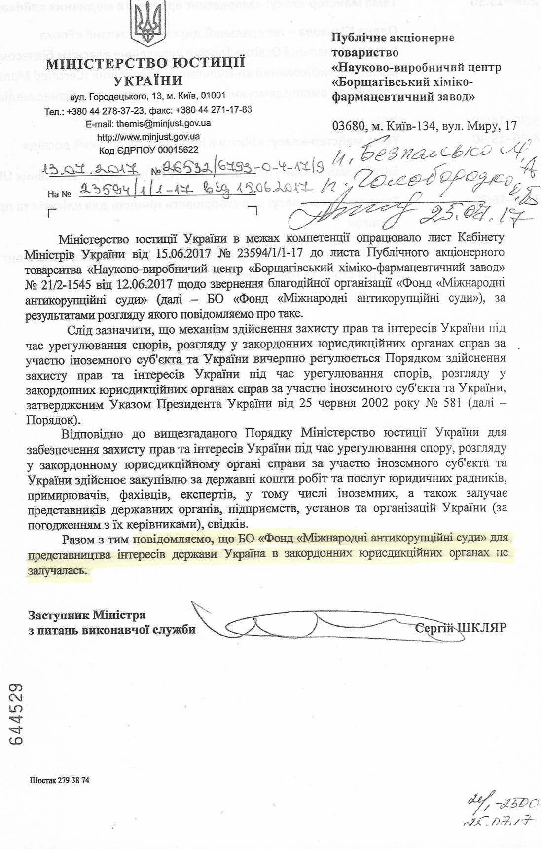 За місяць отримали відповідь з Міністерства юстиції за підписом заступника міністра Сергія Шкляра, де повідомлялося, що "БО "Фонд "Міжнародні антикорупційні суди" для представництва інтересів держави Україна в закордонних юрисдикційних органах не залучалась".