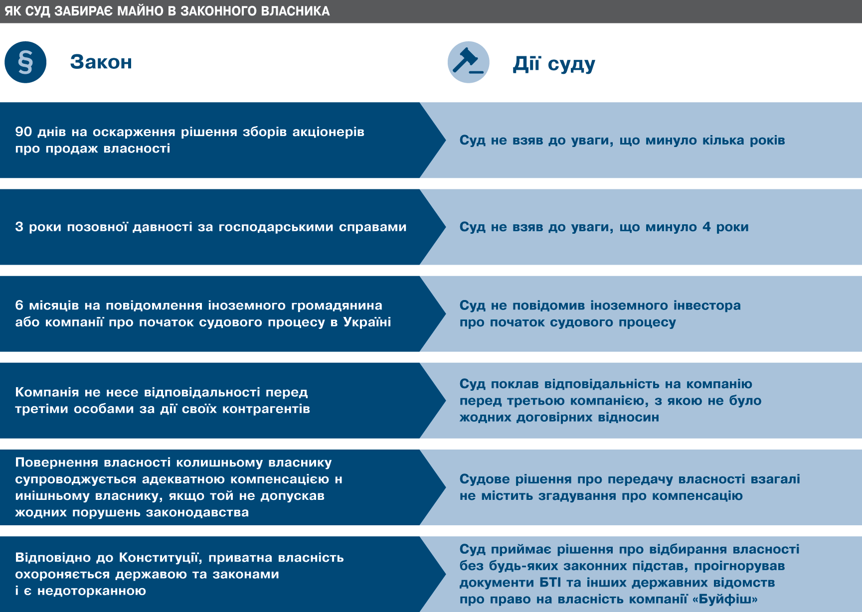 Всупереч тому, що минули терміни давності, всупереч тому, що компанія не може нести відповідальності перед третьою стороною ("Буйфіш" нічим не зобов'язаний "Автотранссервісу" і вже тим більше банку "Надра"), всупереч відсутності на суді іноземного поручителя, суд ухвалив рішення про банальне відбирання власності без будь-якої компенсації. Тобто "Буйфіш" витратив на купівлю гроші, але тепер залишається і без грошей, і без власності.