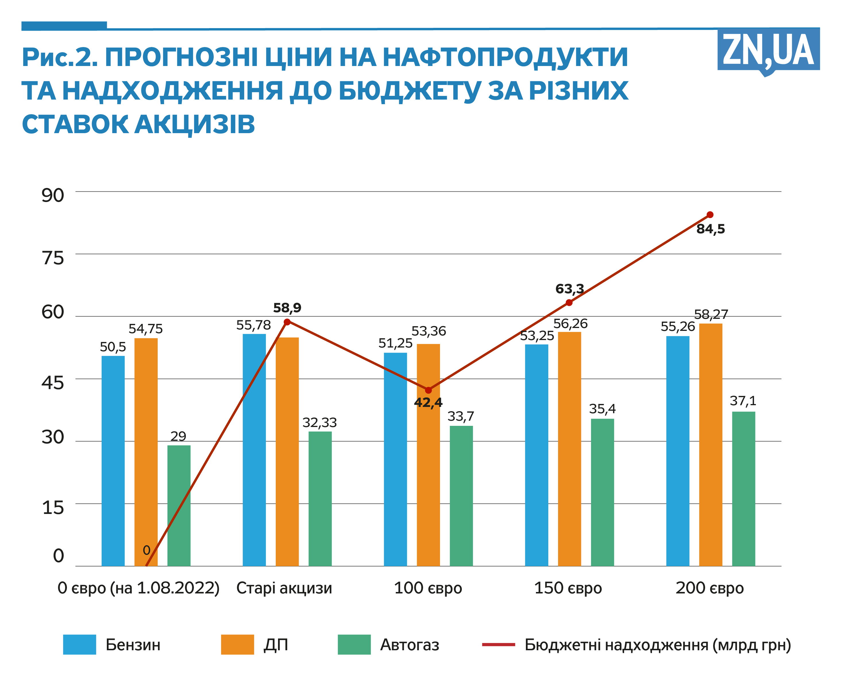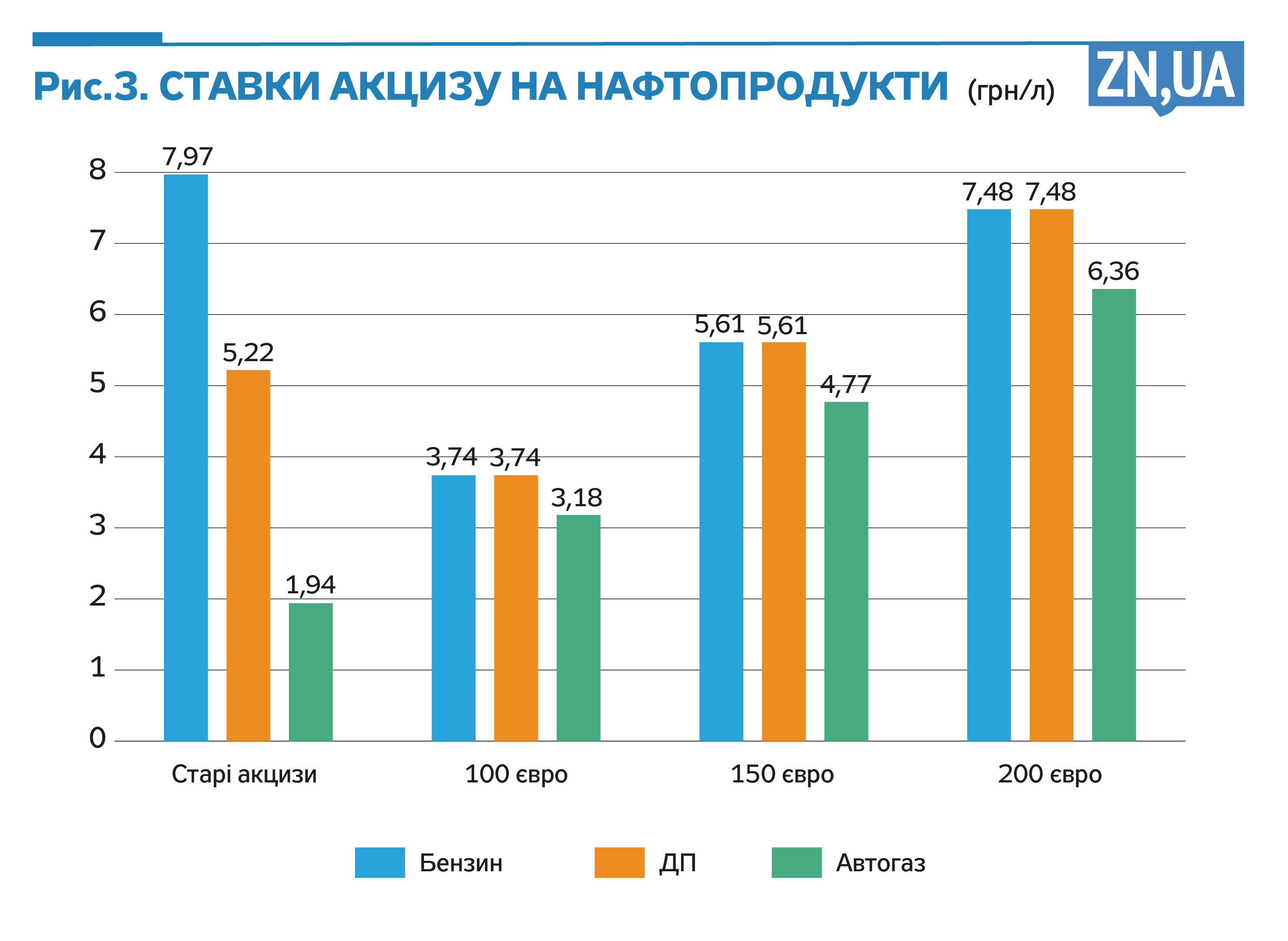Якщо орієнтуватися на збереження поточних роздрібних цін на бензин і дизпаливо, то його забезпечить уніфікований акциз за ставкою 100 євро за 1000 л (відповідно, 85 євро на скраплений газ). Зросте тільки ціна на автогаз до 33,7 грн/л (27,5 грн/л на поточний момент). Прогнозоване співвідношення бензин/газ — 65,5%, що гарантує збереження ефективності його використання для споживачів. При цьому очікуваний обсяг бюджетних надходжень становитиме 3,3 млрд грн на місяць, або 42,3 млрд грн на рік (з ПДВ 7%).