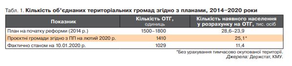 У середньому на одну проєктну ОТГ після завершення реформи припадатиме 25 тисяч жителів, тоді як фактично на початок 2020 року у вже сформованій ОТГ було 11,4 тисячі жителів, тобто вдвічі менше. Таким чином, подальше просування реформи здійснюватиметься шляхом активного приєднання територіальних громад до вже сформованих ОТГ і створення ще частини великих за кількістю населення ОТГ.