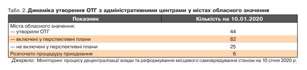 На початок 2020 року утворено 44 ОТГ з адміністративними центрами у містах обласного значення, 133 територіальні громади об'єдналися або приєдналися до міст обласного значення (див. табл. 2). Тобто в середньому до такої міської ОТГ увійшло десь чотири громади. А в Одеській, Харківській областях створено масштабні ОТГ (з десяти тергромад) із центром у містах обласного значення.