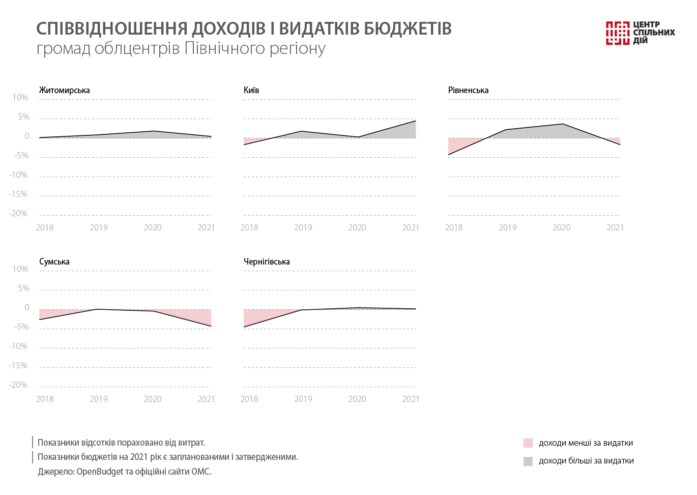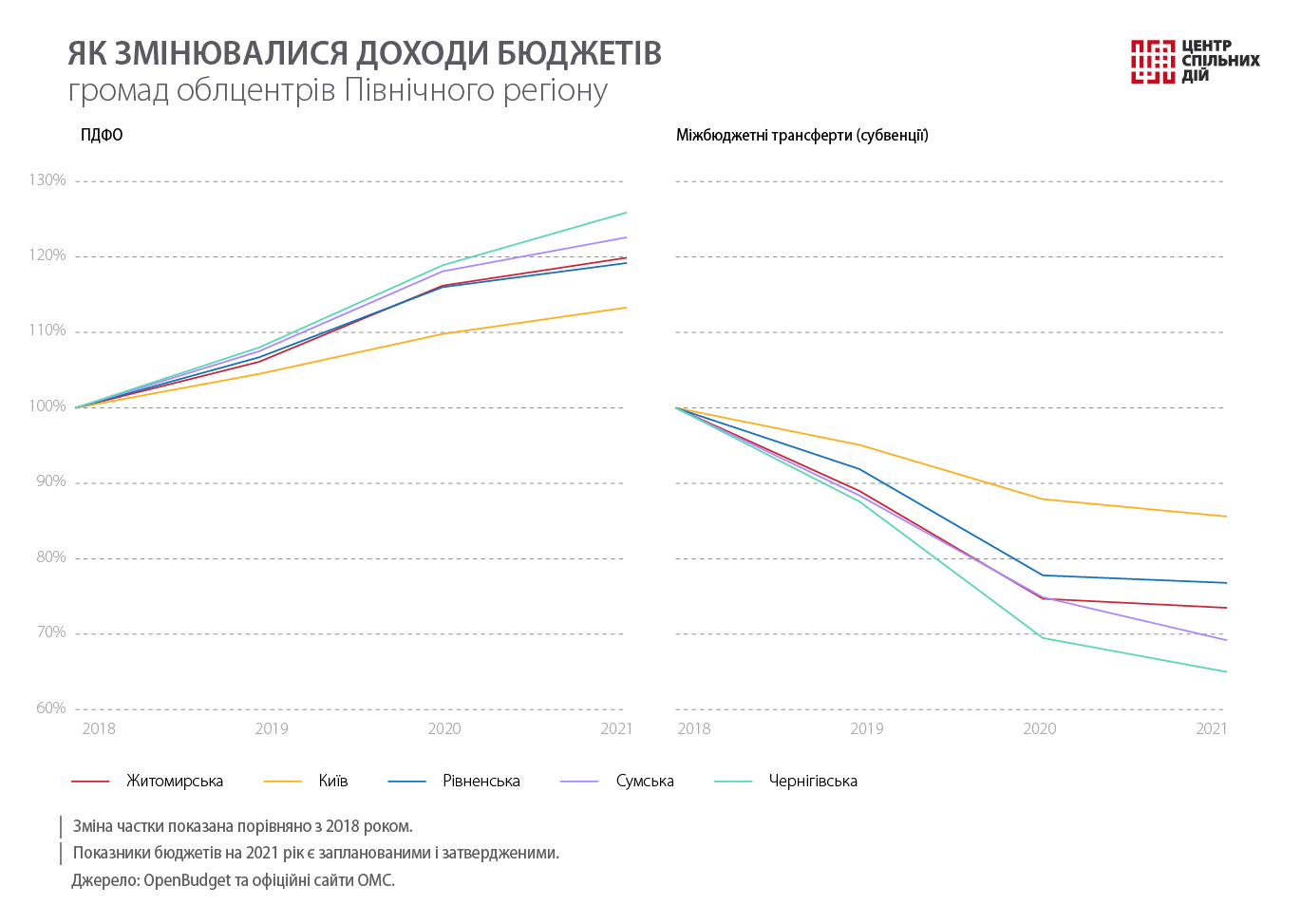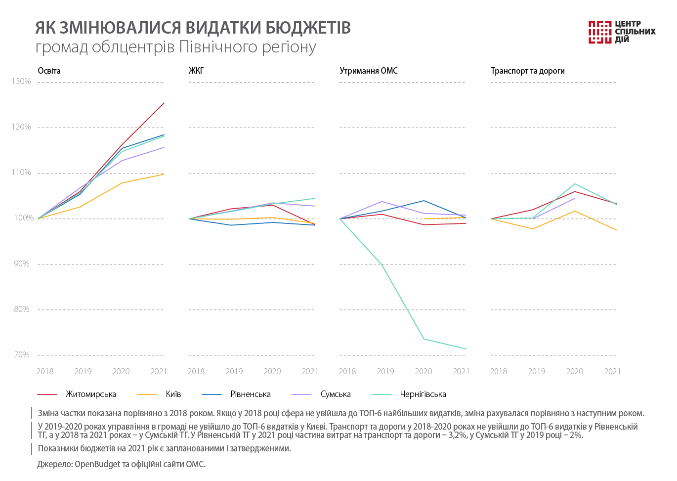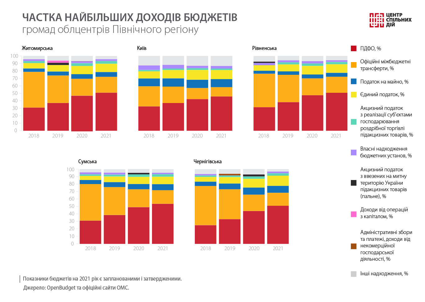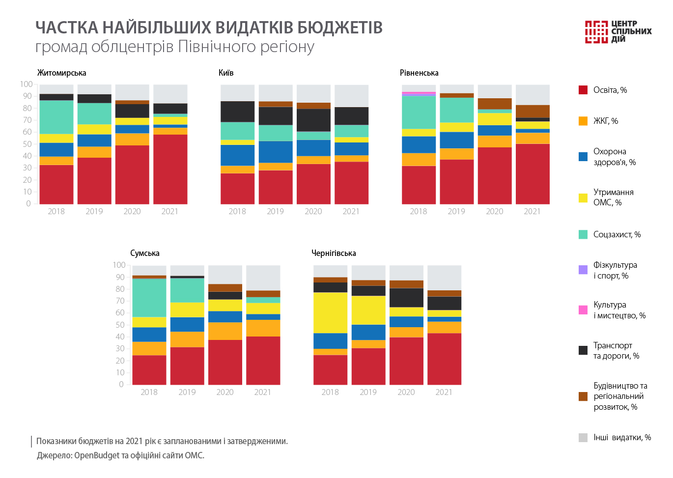 Центр спільних дій продовжує аналізувати бюджети обласних центрів. Ми вже розповідали, як витрачають гроші на Заході, в Центрі, на Півдні та Сході України. Цього разу розглянемо місцеві фінанси облцентрів Півночі України, бюджети Житомирської, Рівненської, Сумської, Чернігівської територіальних громад (ТГ) і міста Києва за 2018–2021 роки. Інформацію взято з Державного веб-порталу Мінфіну та офіційних сайтів органів місцевого самоврядування (ОМС).