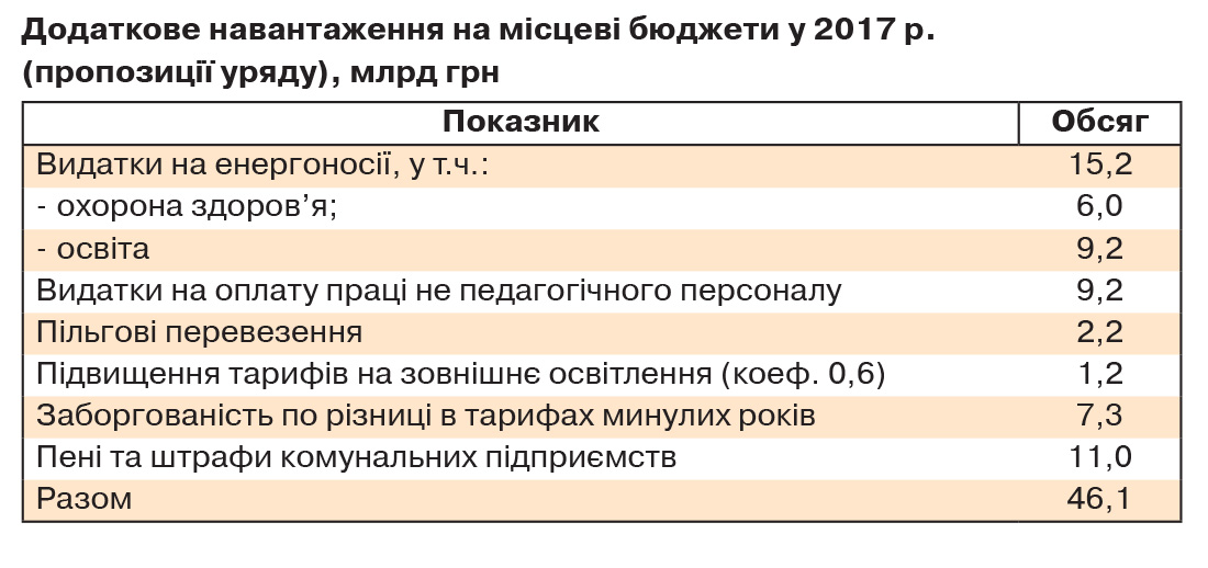 По-третє, не передбачено механізм покриття втрат місцевих бюджетів унаслідок прийняття рішення Національної комісії, що здійснює державне регулювання у сферах енергетики та комунальних послуг, щодо підвищення у 2,5 разу тарифів на електроенергію для зовнішнього освітлення населених пунктів. Це призведе до додаткових втрат органів місцевого самоврядування на суму понад 1,2 млрд грн (постановою НКРЕКП №3141 від 28 грудня 2015 р. коефіцієнт збільшено з 0,25 до 0,6 з 1 березня 2016-го). Таким чином, додаткове навантаження на місцеві бюджети у 2017 р. наведене у таблиці.