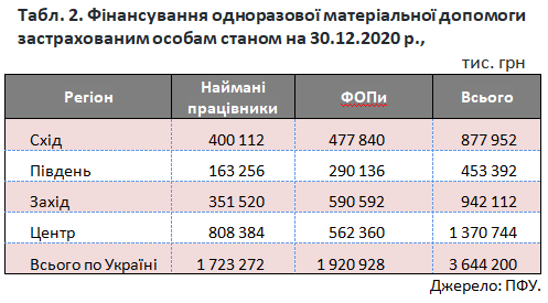 2020 року було також запроваджено разові виплати в сумі до 8000 грн, які можуть отримати наймані працівники або ФОПи (див. табл. 2). Фактично це одноразова матеріальна допомога застрахованим особам, які можуть втратити доходи у разі повної заборони сфери їх діяльності внаслідок посилення обмежувальних протиепідемічних заходів.