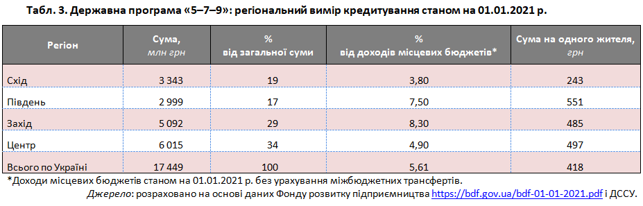 Важливу роль у підтримці місцевого бізнесу відіграє Державна програма «5–7–9», яка складається з трьох компонентів, а саме: компенсації процентів, кредитних гарантій та антикризової підтримки (див. табл. 3).