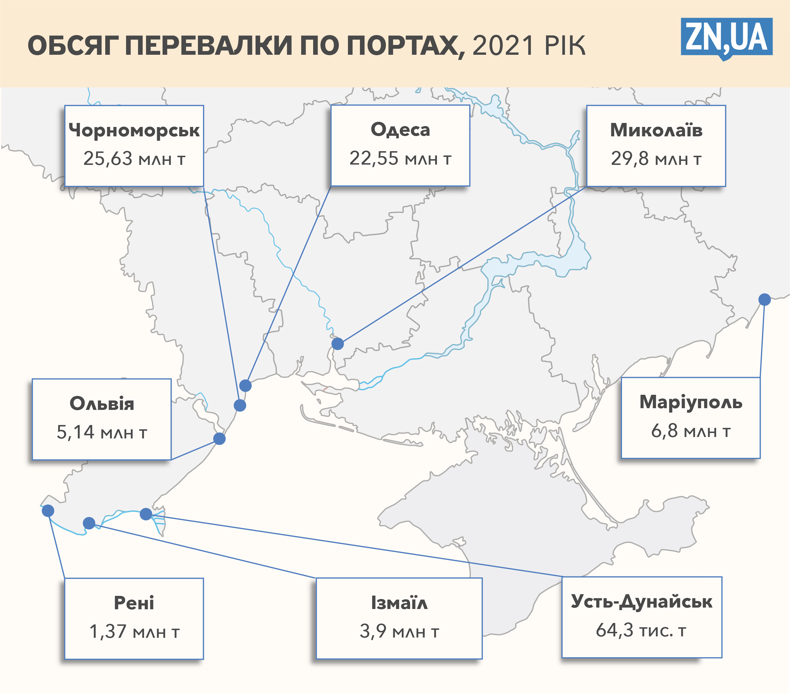 У 2021 році через наші порти пройшло 153 млн т вантажів, із них на експорт перевантажено 118 млн т, прийнято як імпорт — 24 млн т вантажів. Найбільше за рік у портах було оброблено зернових вантажів та руди — відповідно, 49,9 млн і 37,75 млн тонн.