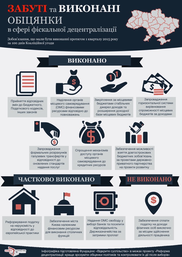 Децентралізація разом із боротьбою з корупцією була найпопулярнішою обіцянкою політичних сил, які пройшли до парламенту України. Виборців цікавить, що з обіцяного в сфері фіскальної децентралізації виконала нинішня парламентська коаліція та уряд після ста днів його роботи. Саме на перший квартал 2015 р. згідно з коаліційною угодою було заплановано заходи з фінансової децентралізації. Чи стало більше фінансових можливостей у місцевих бюджетів, що несуть зміни міжбюджетних відносин і що забули виконати політики?