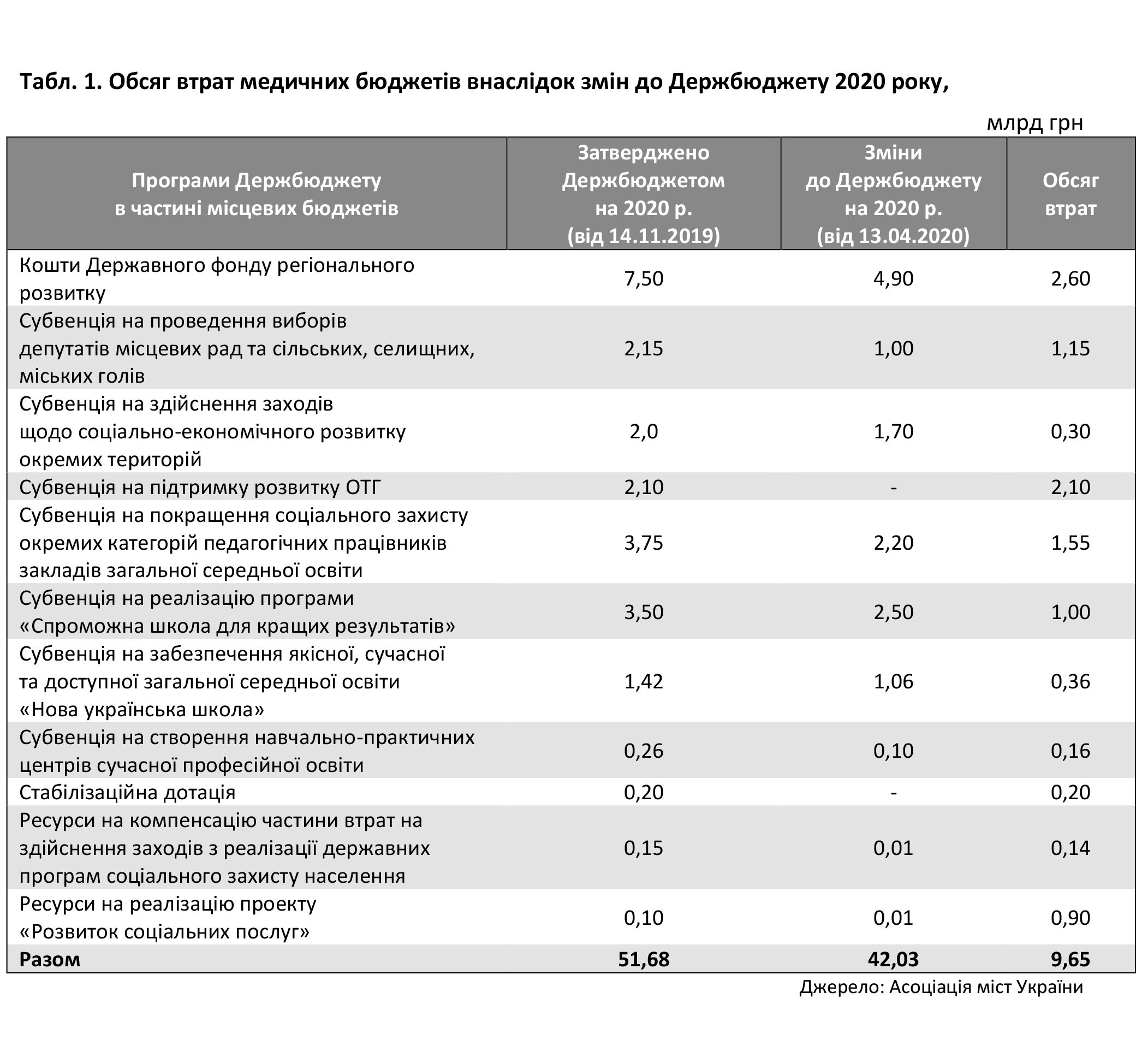 Загалом унаслідок часткового та повного скорочення окремих бюджетних програм (зміни до держбюджету від 13.04.2020 р.) місцеві бюджети зазнали втрат в обсязі 9,65 млрд грн (див. табл. 1), зокрема, спричинених скороченням обсягу коштів Державного фонду регіонального розвитку на 2,6 млрд грн і субвенцій: на підтримку розвитку ОТГ (на 2,1 млрд), на покращення соціального захисту окремих категорій педагогічних працівників закладів загальної середньої освіти (на 1,6 млрд), на реалізацію програми «Спроможна школа для кращих результатів» (на 1 млрд) тощо.
