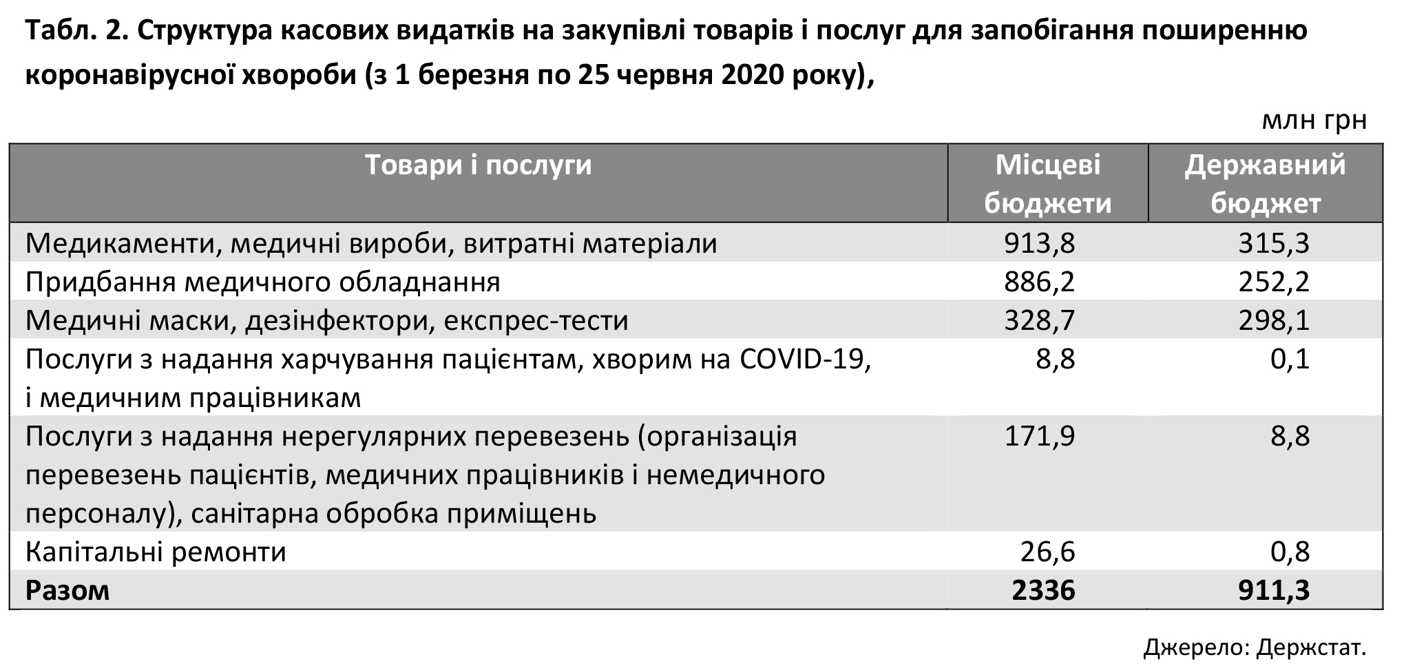За даними Держказначейства, тільки за перші чотири місяці боротьби з COVID-19 з місцевих бюджетів здійснено платежів на суму 2,3 млрд грн (див. табл. 2). Наведені цифри свідчать, що 72%, або понад дві третини всіх видатків на боротьбу з коронавірусом, — це кошти якраз місцевих бюджетів.