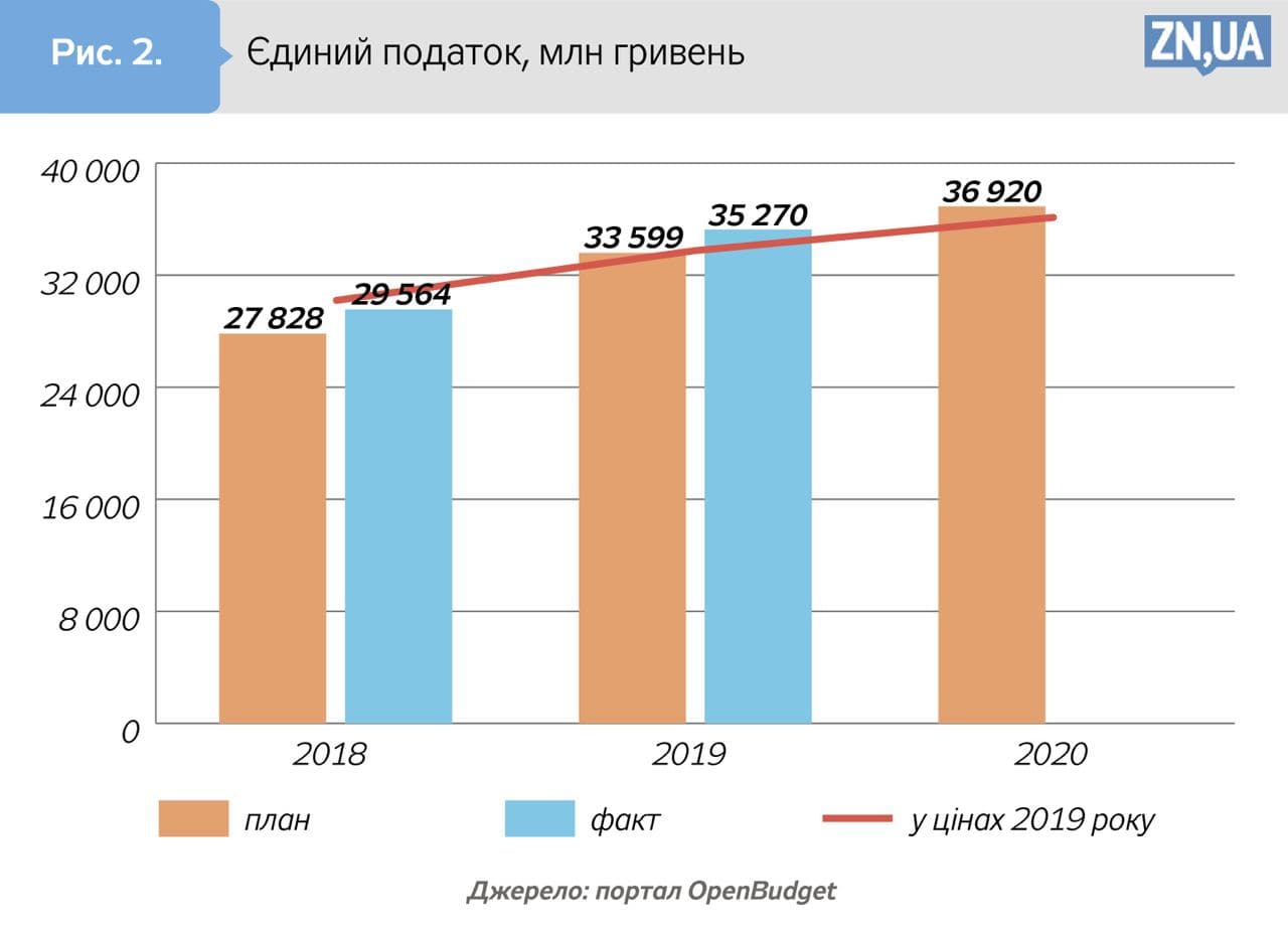 Ще одним джерелом власних доходів є місцеві податки, серед яких вагому частку займає єдиний податок, що сплачується малим бізнесом. Якщо проаналізувати показники останніх років, то побачимо, що обсяги надходжень цього податку теж зростають. Почасти тому, що зростає ставка податку та змінюються правила його адміністрування, почасти справді завдяки розвитку дрібного підприємництва (див. рис. 2).