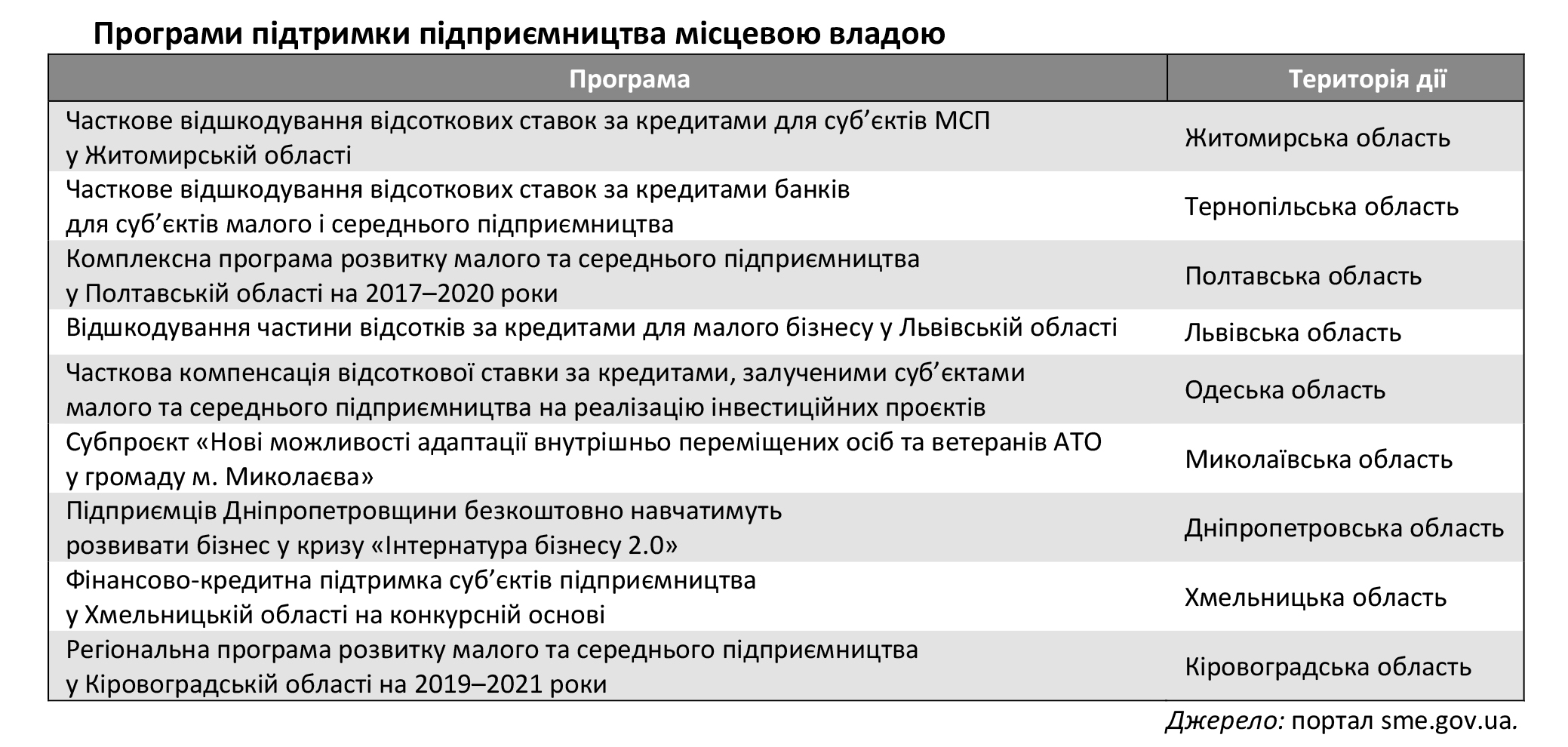 З найбільшими діючими програмами підтримки бізнесу місцевою владою можна ознайомитися в таблиці.