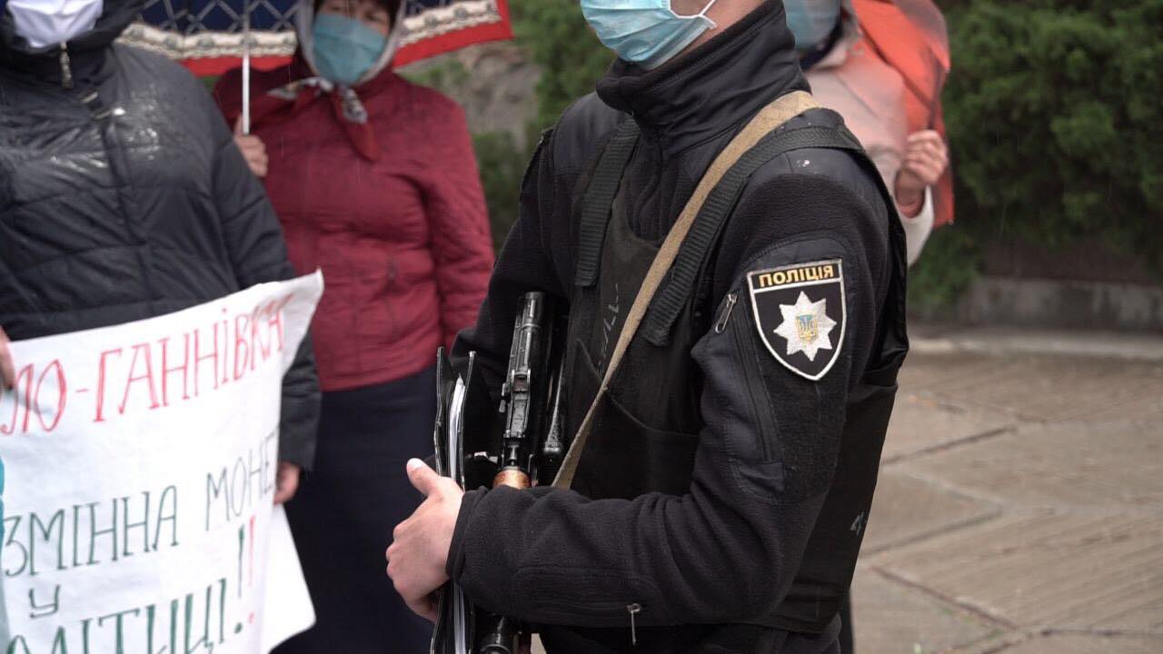 Жителі Кирило-Ганнівки продовжують боротьбу. Незважаючи на те, що людям відкрито погрожують, залякують, а на мітинг під ОДА прийшли правоохоронці з автоматами (!): це на кілька десятків людей, переважно пенсійного віку.